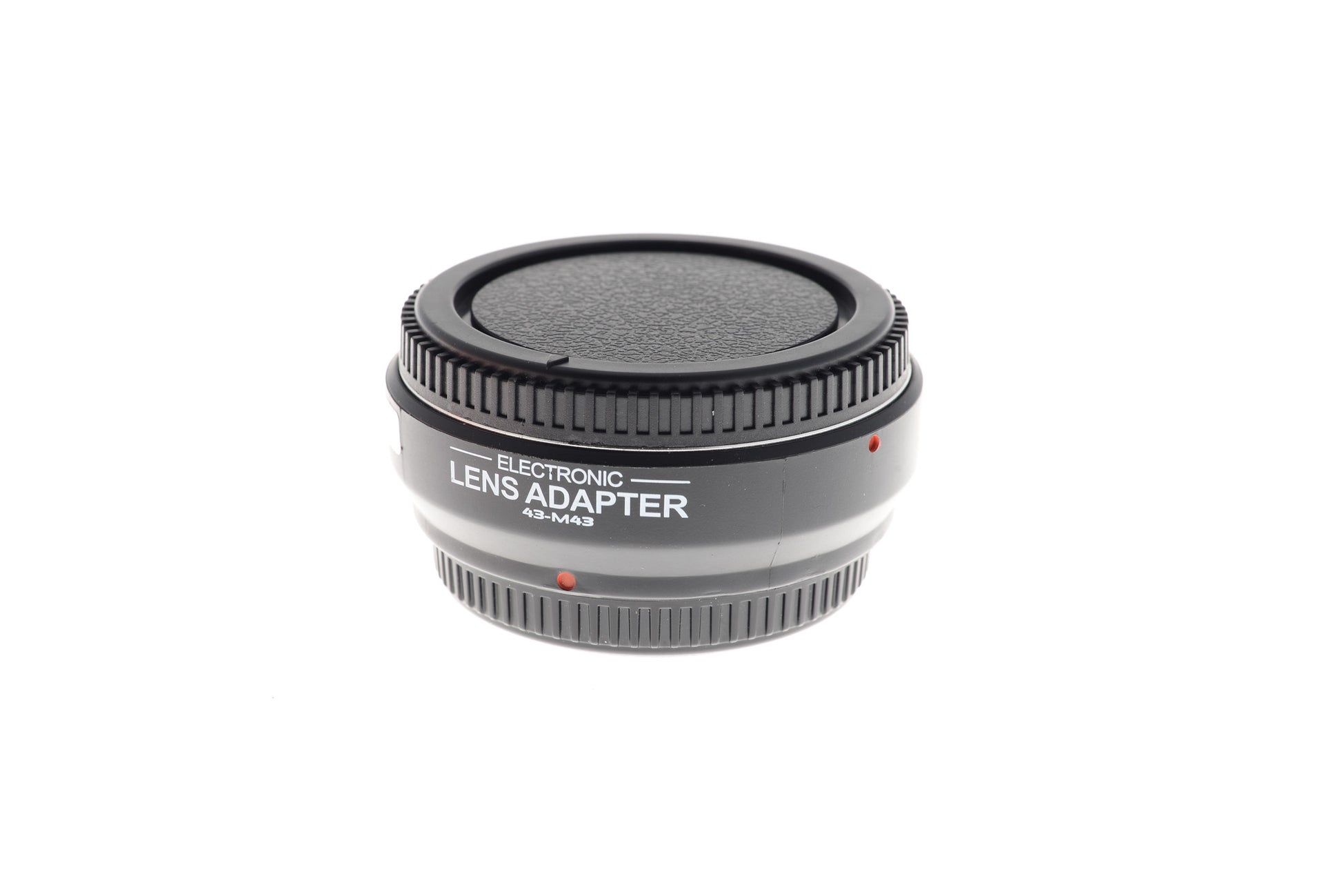 Plastic third party adapter for mounting Four Thirds lenses to Micro Four Thirds cameras. Contacts for conveying electronic information and built-in tripod mount.