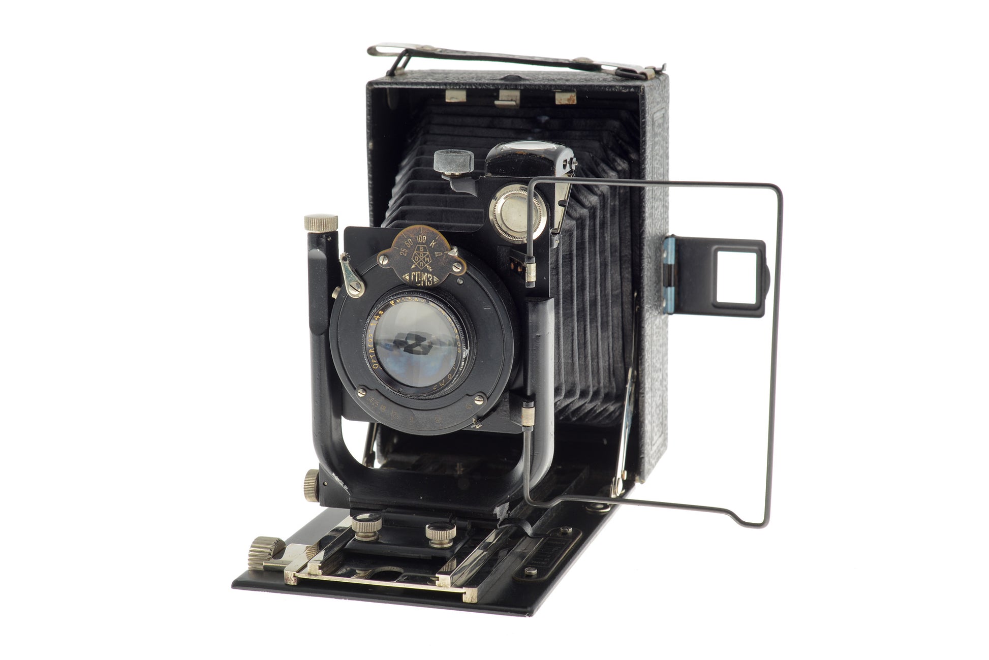 Manual focus large format 9x12cm plate folding camera released by Gomz in 1934. Metal body available in black.