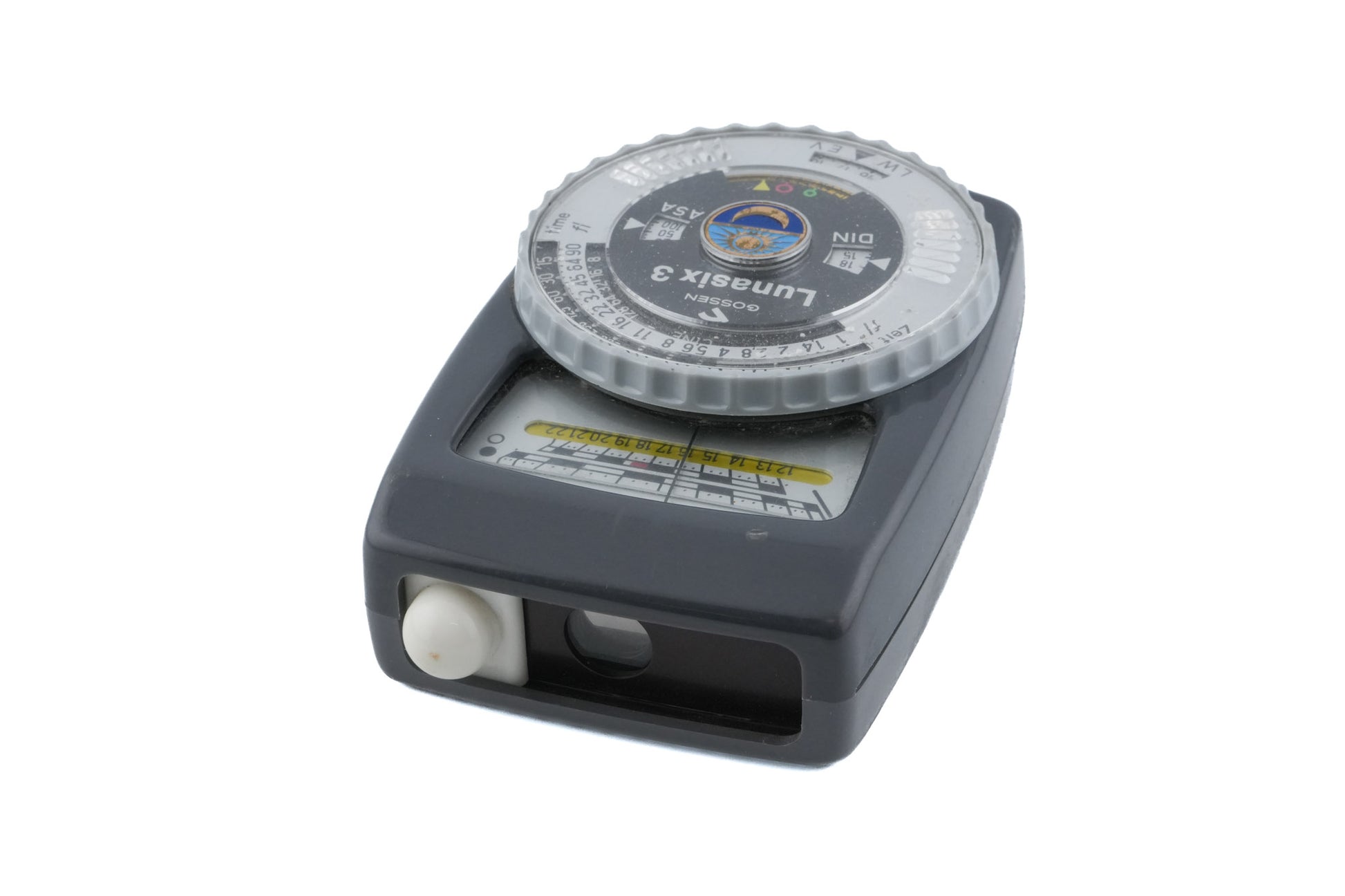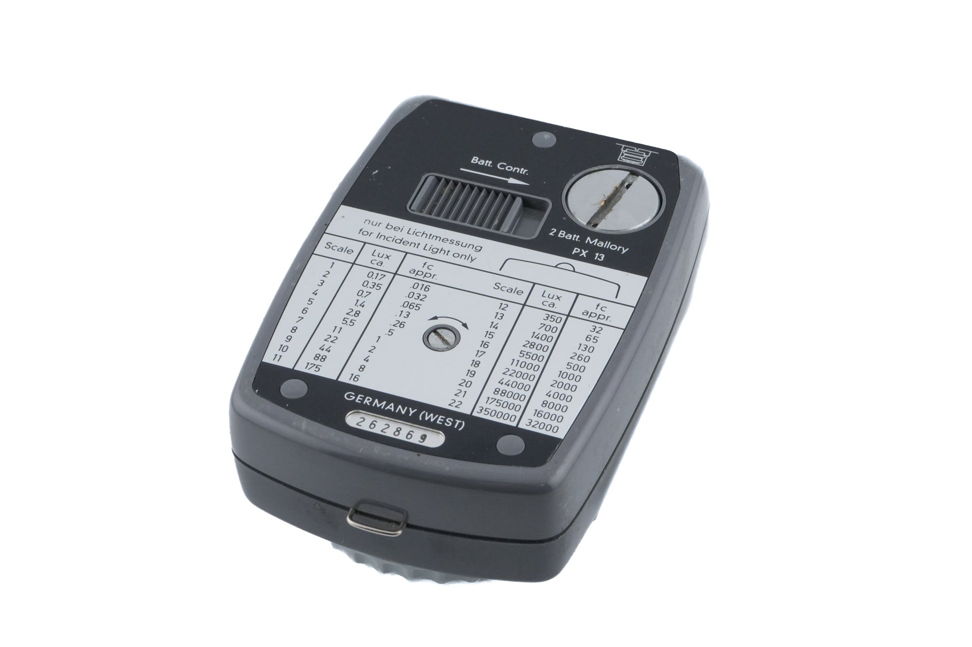 Handheld exposure meter made by Gossen introduced in 1966. Features a sliding incident dome. Plastic body available in grey.