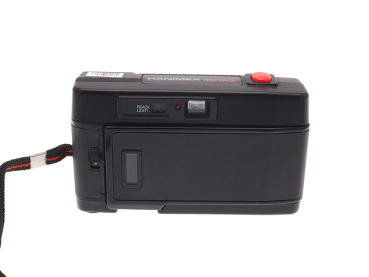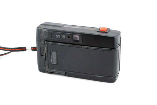 35mm point and shoot camera with built-in flash. Features include fill flash mode and an integrated lens cover. Plastic body available in black.