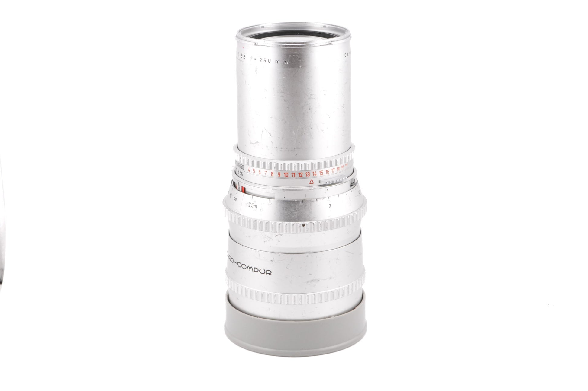 Manual focus telephoto lens made for Hasselblad V system medium format SLR cameras by Carl Zeiss starting in 1957. The 250mm was one of the original lenses made for the 500C. Early versions do not have a depth-of-field preview button. The lens is sharpest wide open at f5.6. Metal body available in silver and black.