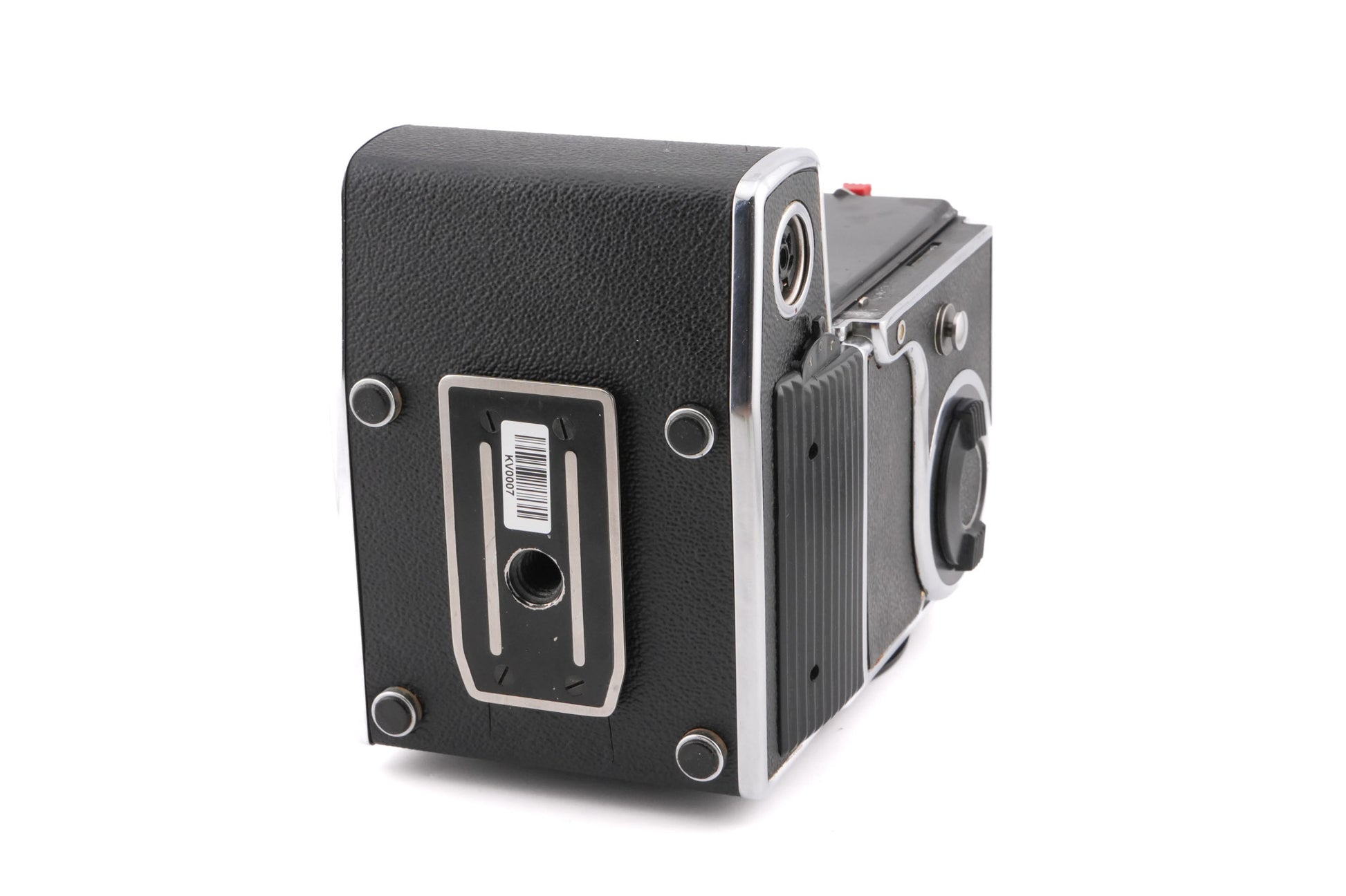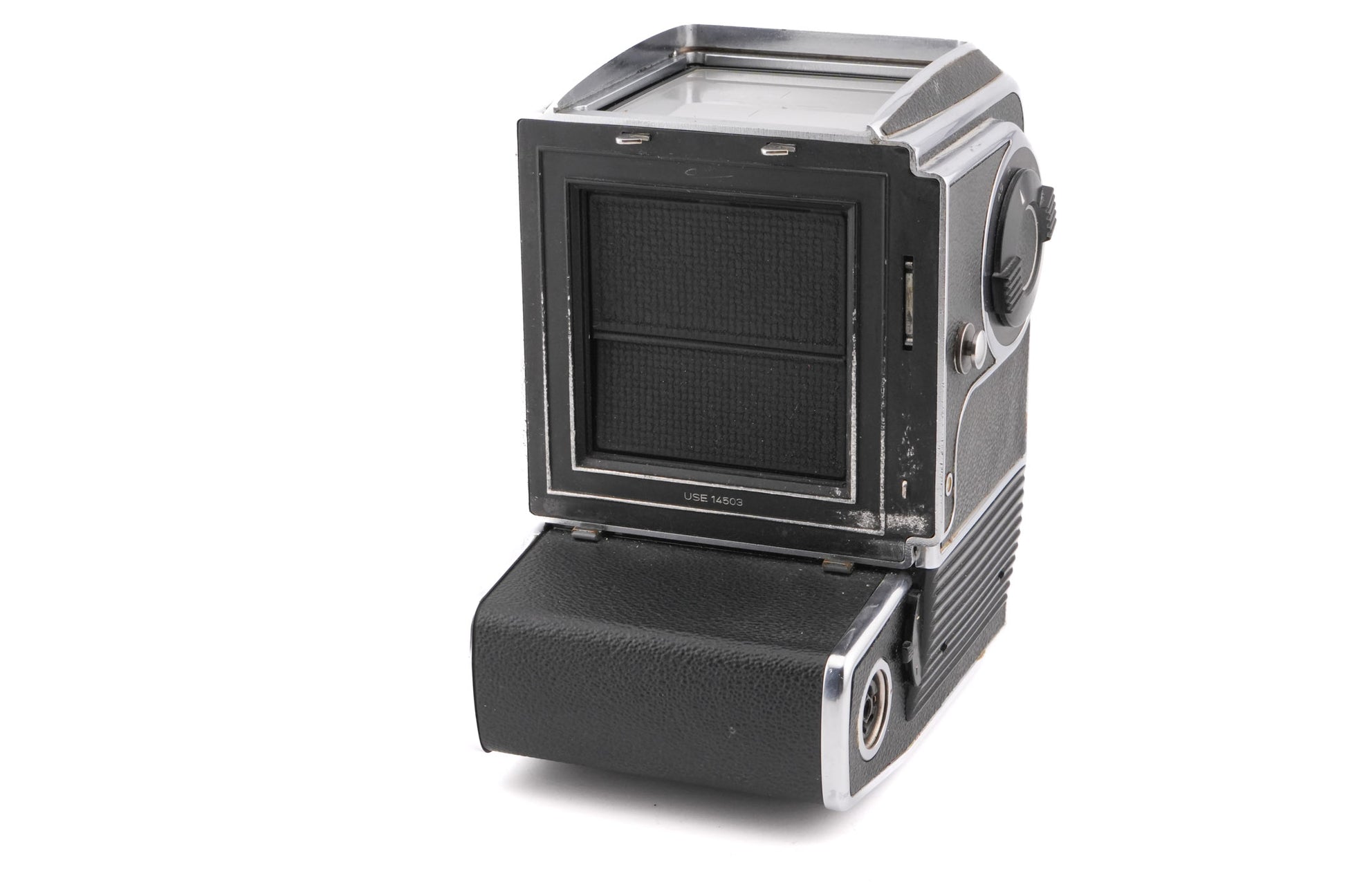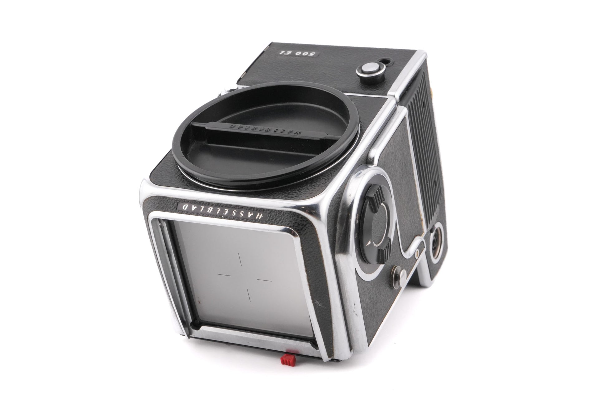 Manual focus V series 120 SLR camera released by Hasselblad in 1965. Although the camera is a completely new design it is, generally speaking, a motorized 500C. The motor allowed the camera to do sequence photography and unattended documentation photography. This was also the camera used by NASA on the Apollo 11 mission to photograph the moon and Earth. The camera uses a unique Ni-Cad battery made up of two 1.2-volt nicad cells connected in a plastic sleeve to deliver 6 volts. Like the 500C, the focusing screen is not user-interchangeable. Metal and plastic body available in silver.