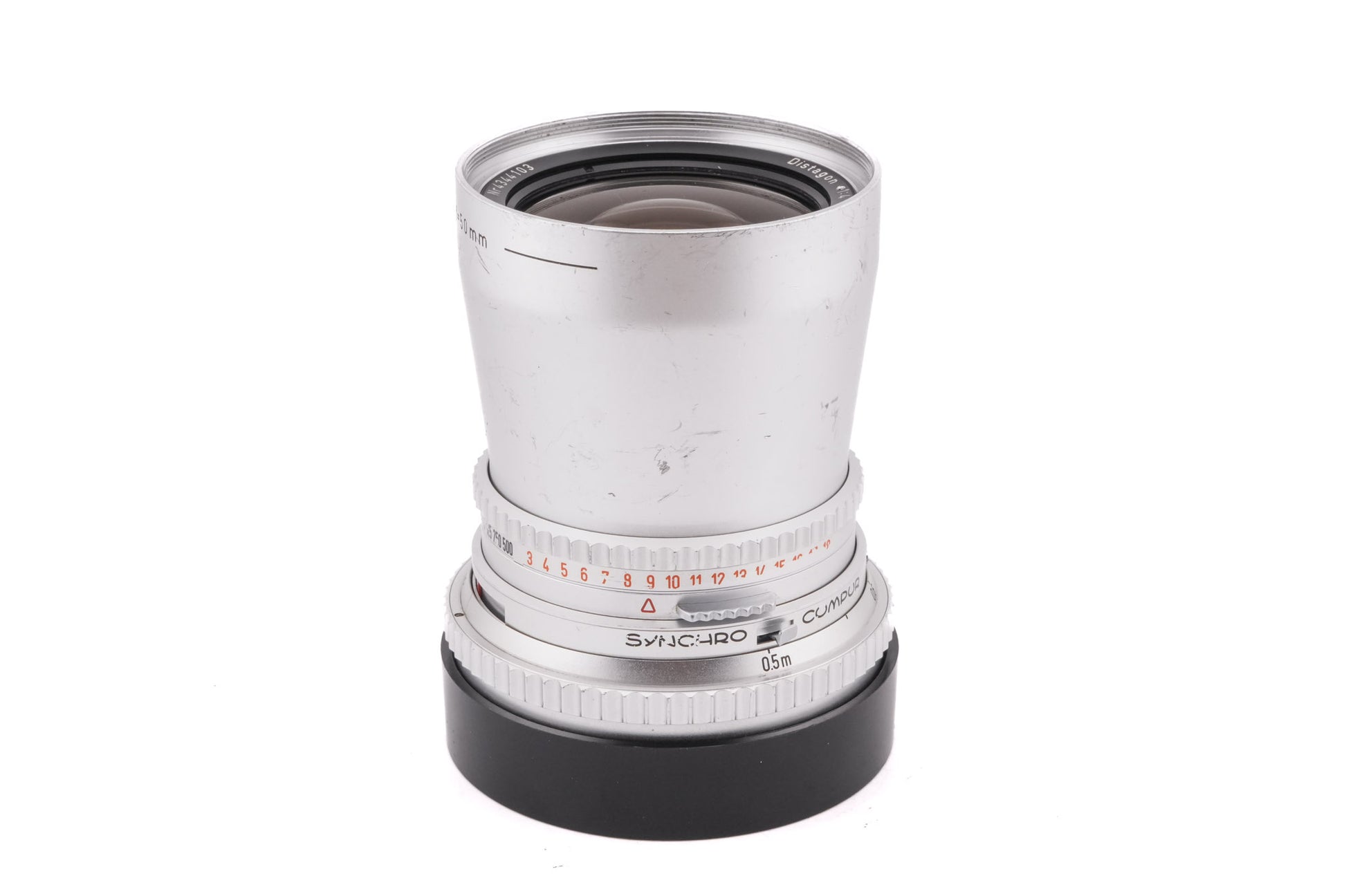 Manual focus wide-angle lens made for V series 120 SLRs by Hasselblad starting in 1965. It gives the equivalent field of view to a 28mm lens on full frame/35mm. This is the first version of the lens without T* multicoating. Metal body available in silver.
