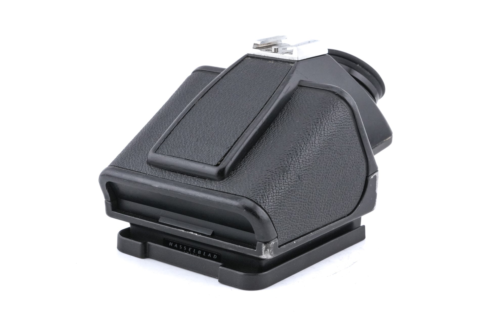 Prism viewfinder made for V series 120 SLRs by Hasselblad starting in 1987. It is essentially a meterless version of the PME finder (42293) and was soon superceded by the PM5 finder (42308) that offered a cutout for the data display of the TCC/FE cameras. Metal and plastic body available in black.