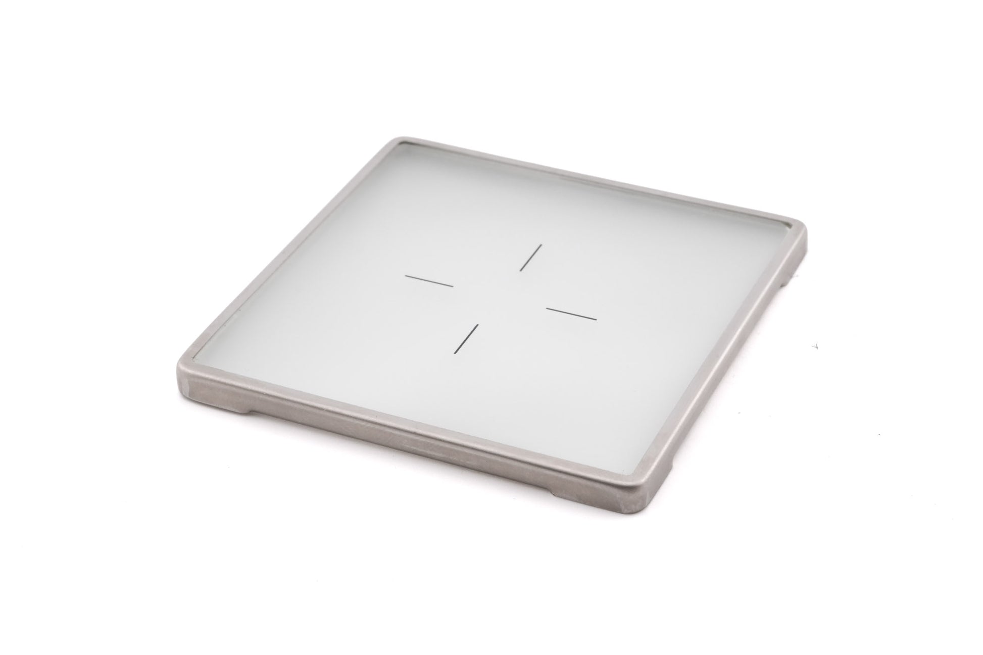 Focusing screen made for V series 120 SLRs by Hasselblad. This was the standard screen for Hasselblads from 1971 to 1988. It features painted crosshair-like lines. It's made of translucent glass with a silver metal frame.