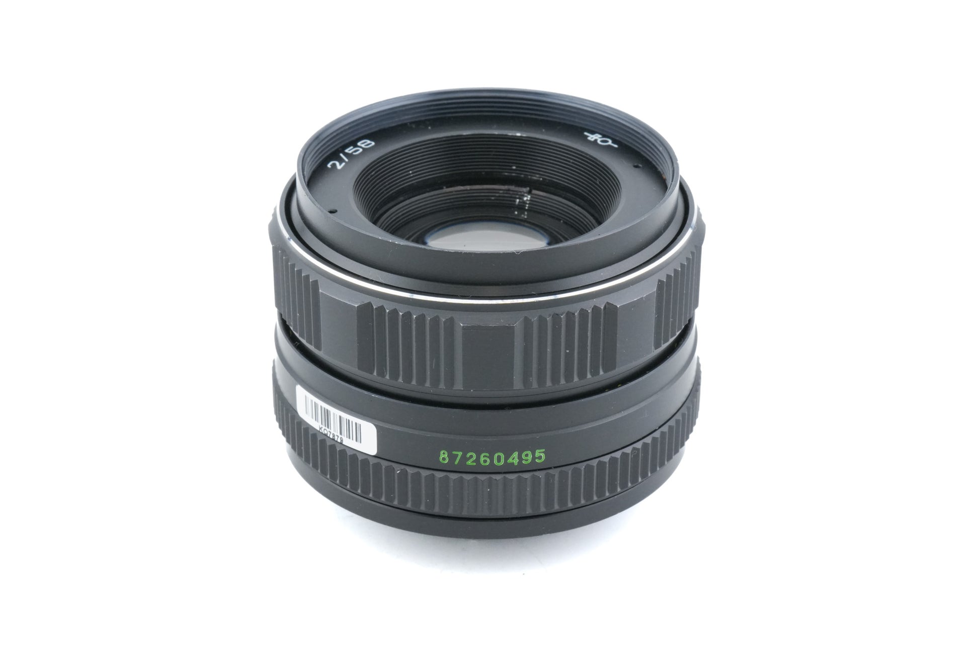 Manual focus normal lens made for M42 mount 35mm SLR cameras in the Soviet Union. Produced as the standard lens for many Soviet SLRs, including Zenits, and produced by many Soviet factories, including KMZ, Zenit, and Valdai. Based on the Carl Zeiss 58mm f2 Biotar. This version lacks an automatic/manual aperture switch. Metal body available in black.