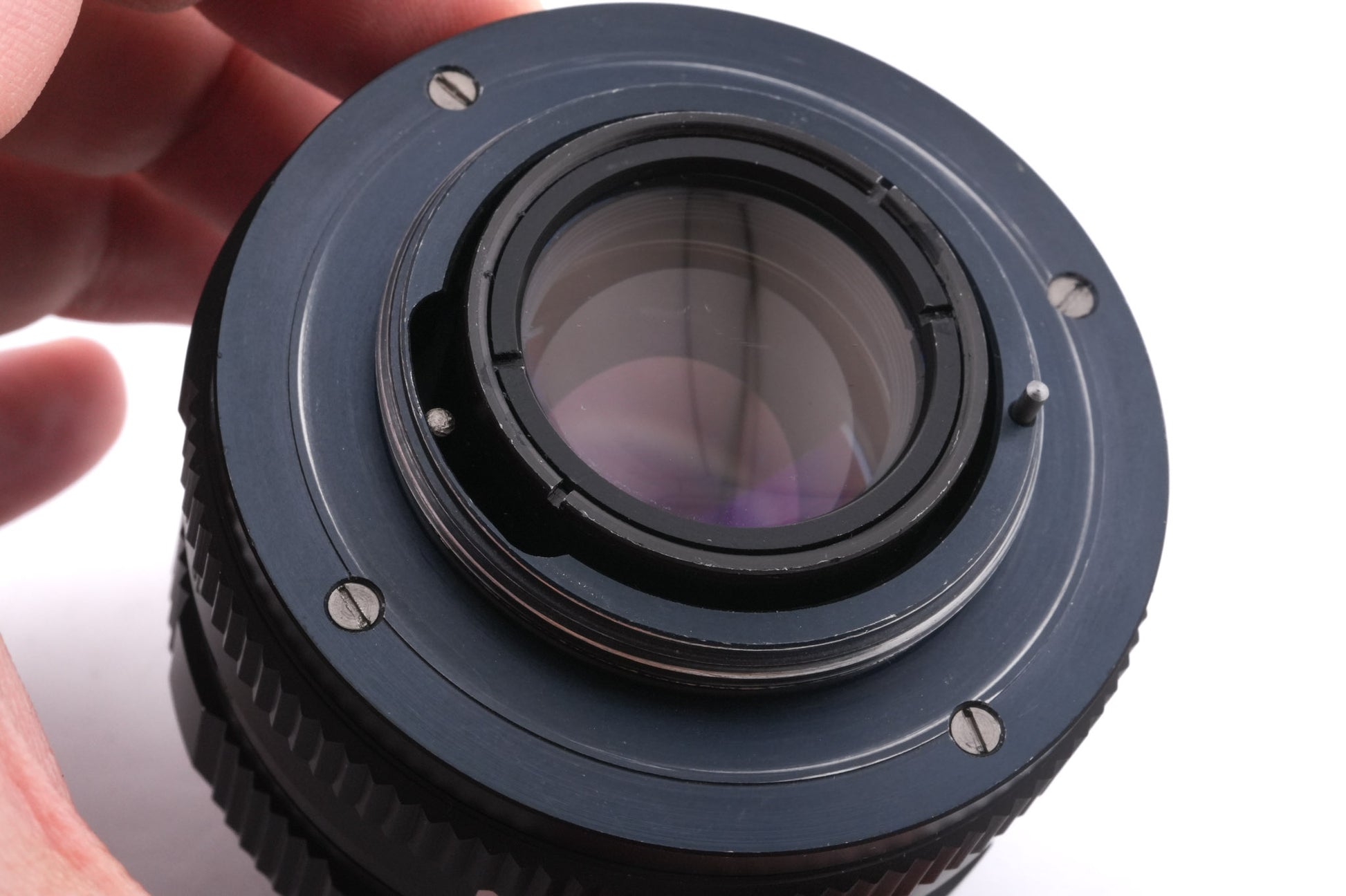 Manual focus normal lens made for M42 mount 35mm SLR cameras in the Soviet Union. Produced as the standard lens for many Soviet SLRs, including Zenits, and produced by many Soviet factories, including KMZ, Zenit, and Valdai. Based on the Carl Zeiss 58mm f2 Biotar. This version lacks an automatic/manual aperture switch. Metal body available in black.