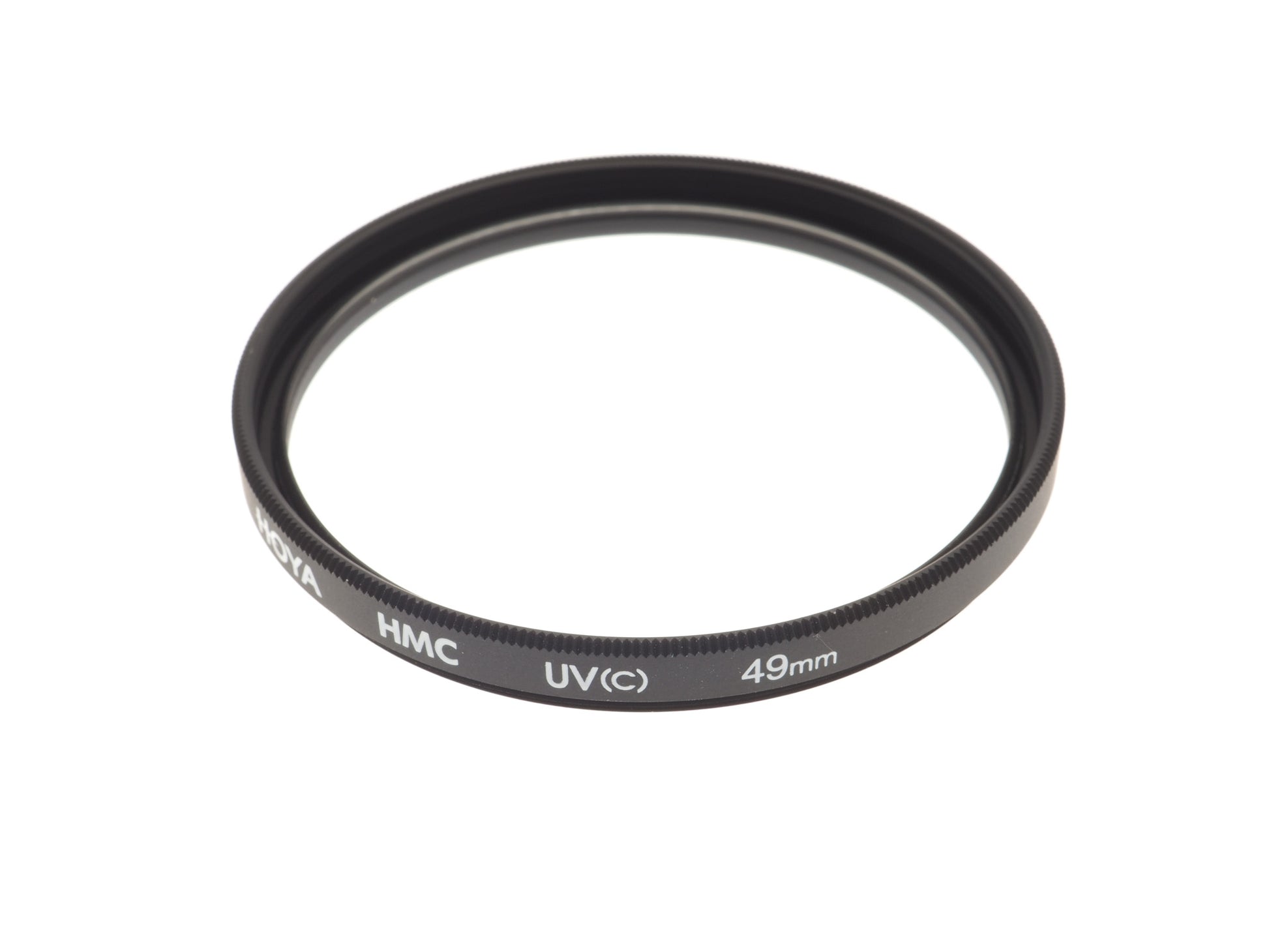 Clear UV / protective filter from Hoya for lenses with 49mm filter threads. Black metal construction with knurled edges.