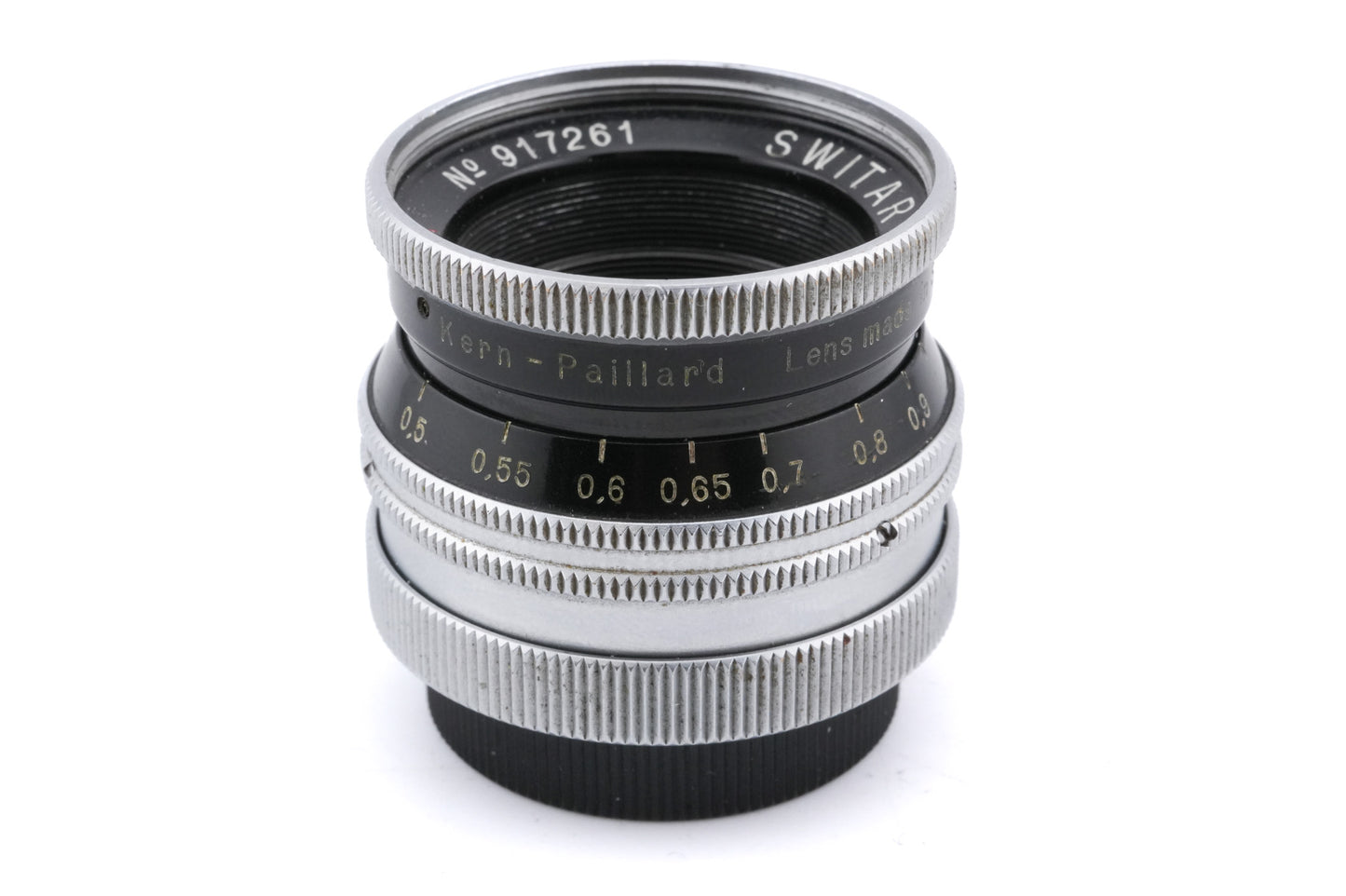 Manual focus normal lens made for C mount SLRs by Kern-Paillard. Metal body available in black/silver.