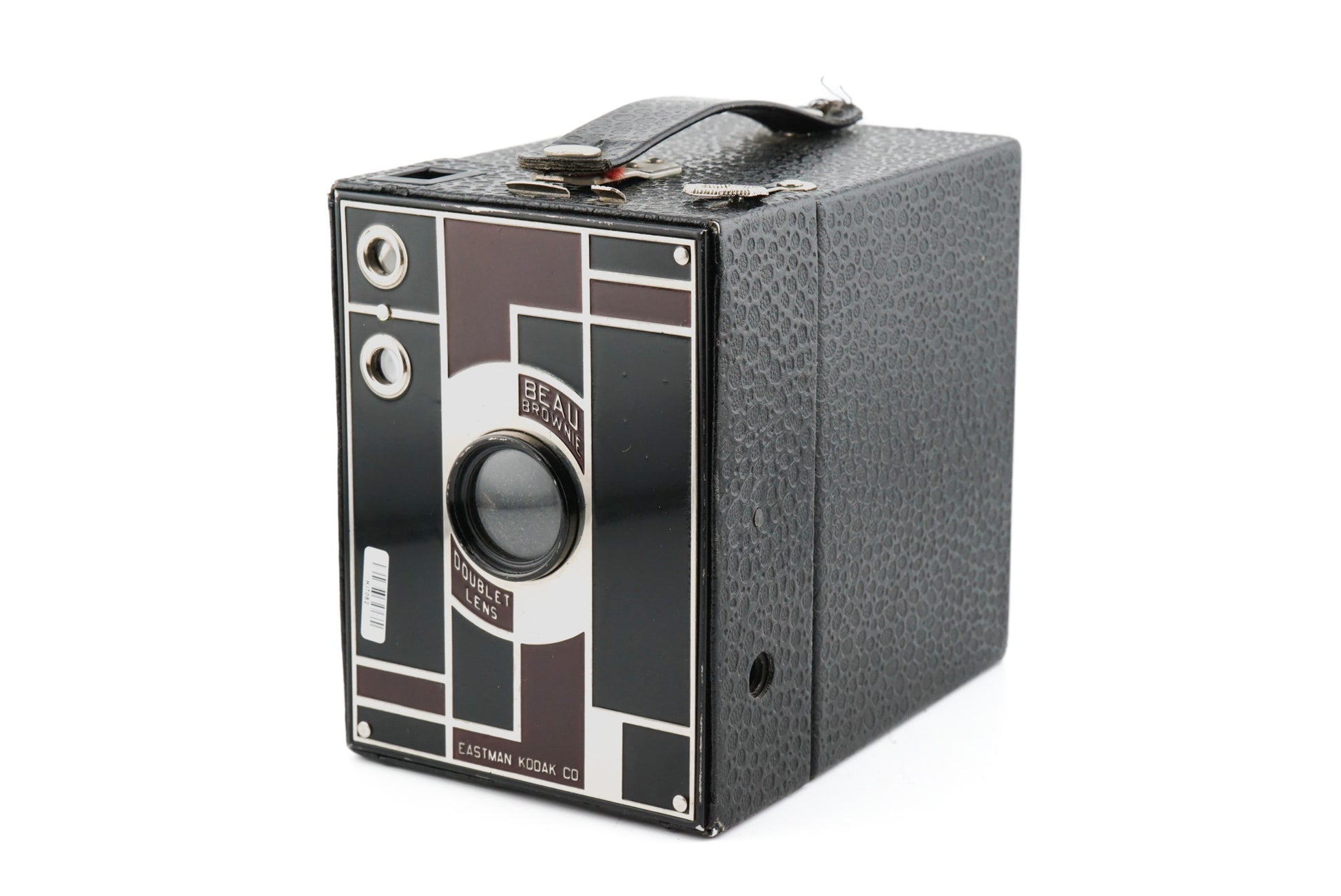 Fixed focus 120 film box camera released by Kodak in 1930. Metal body available in a wide variety of colors and designs.