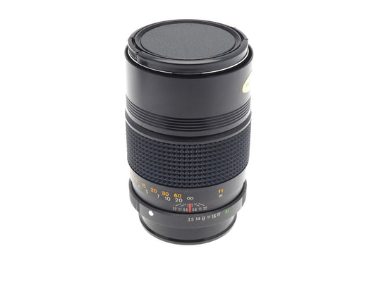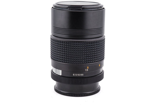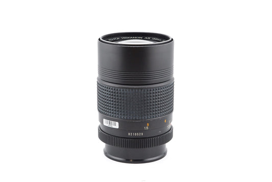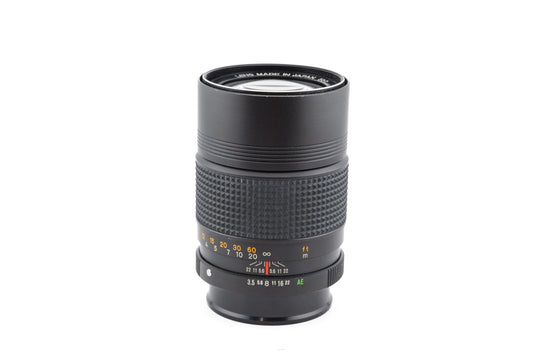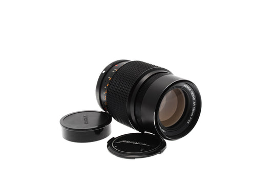 Manual focus telephoto lens made for AR-mount 35mm SLRs by Konica. The lens has an integrated lens hood. Metal body available in black.