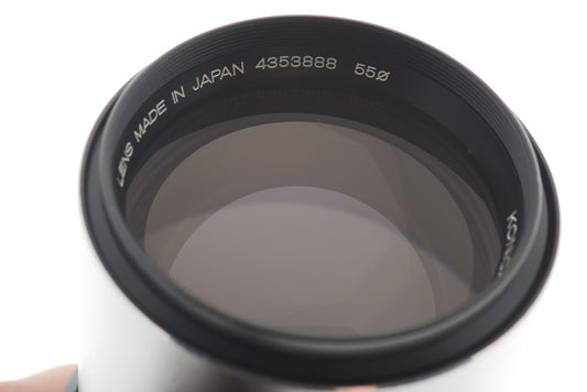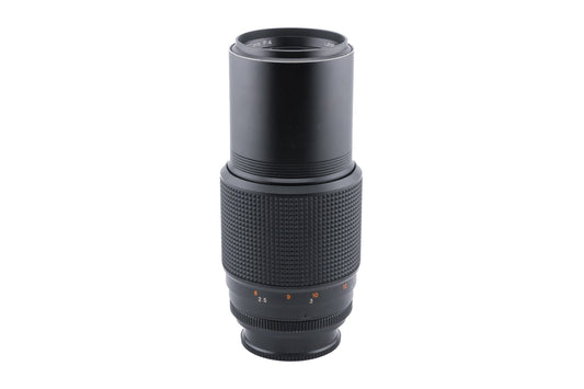 Manual focus telephoto lens made for AR mount 35mm SLRs by Konica. Early versions were made by Tamron, and later ones by Konica. Later versions can be identified by a minimum aperture of f22. Has a built-in lens hood. Metal body available in black.