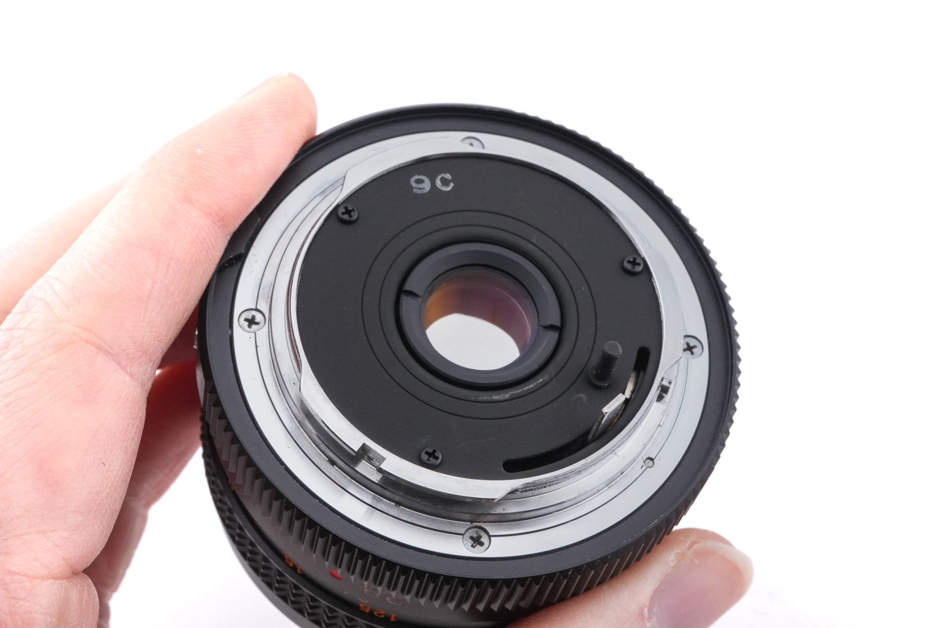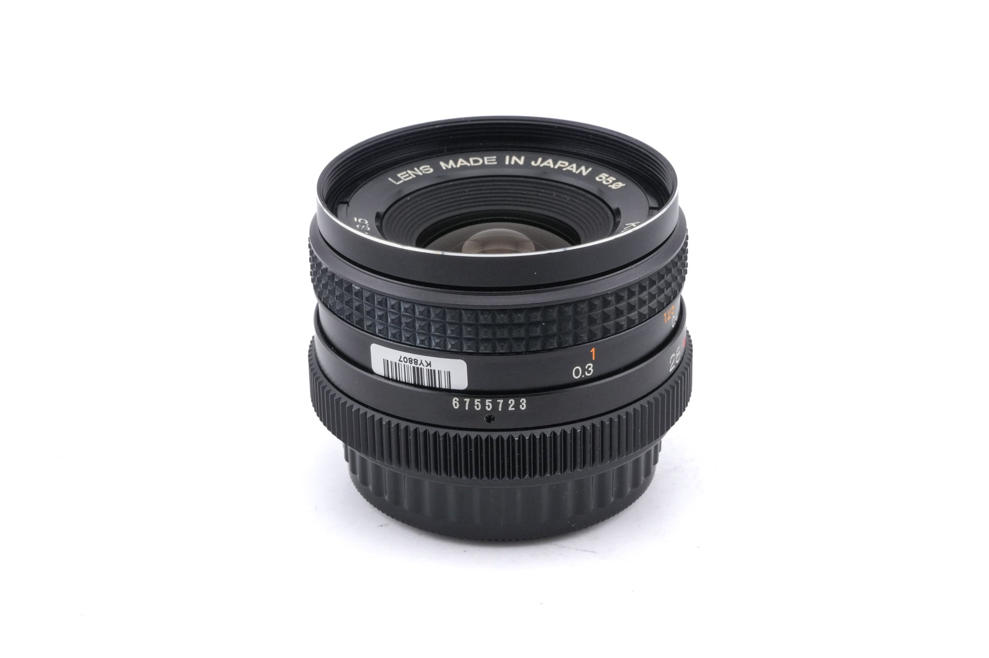 Manual focus wide-angle lens made for AR-mount 35mm SLR cameras introduced by Konica. Older models are slightly larger and have a metal scalloped focus ring, whereas newer models are shorter and have a rubber focus ring. Metal body available in black.
