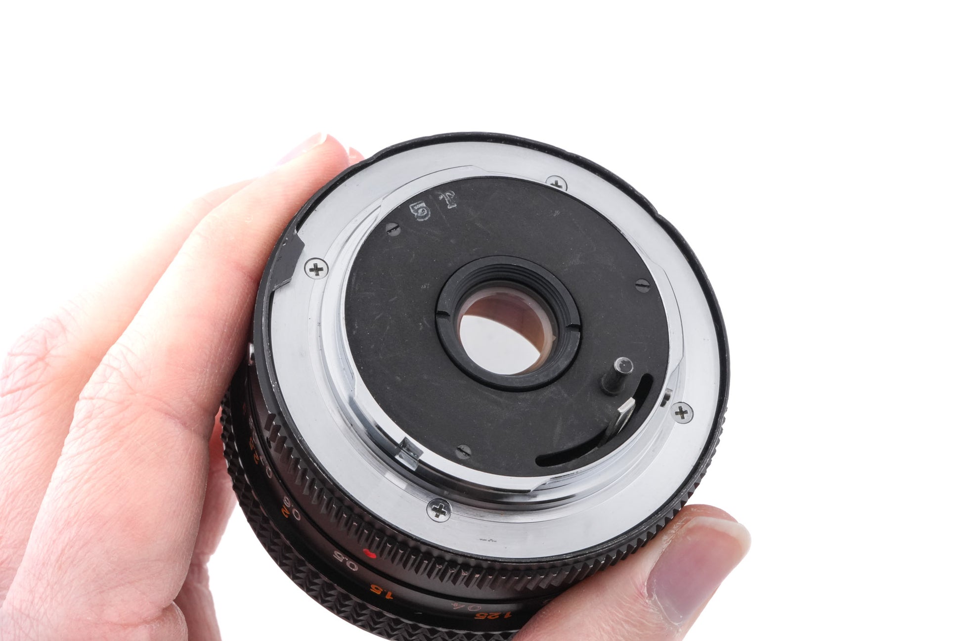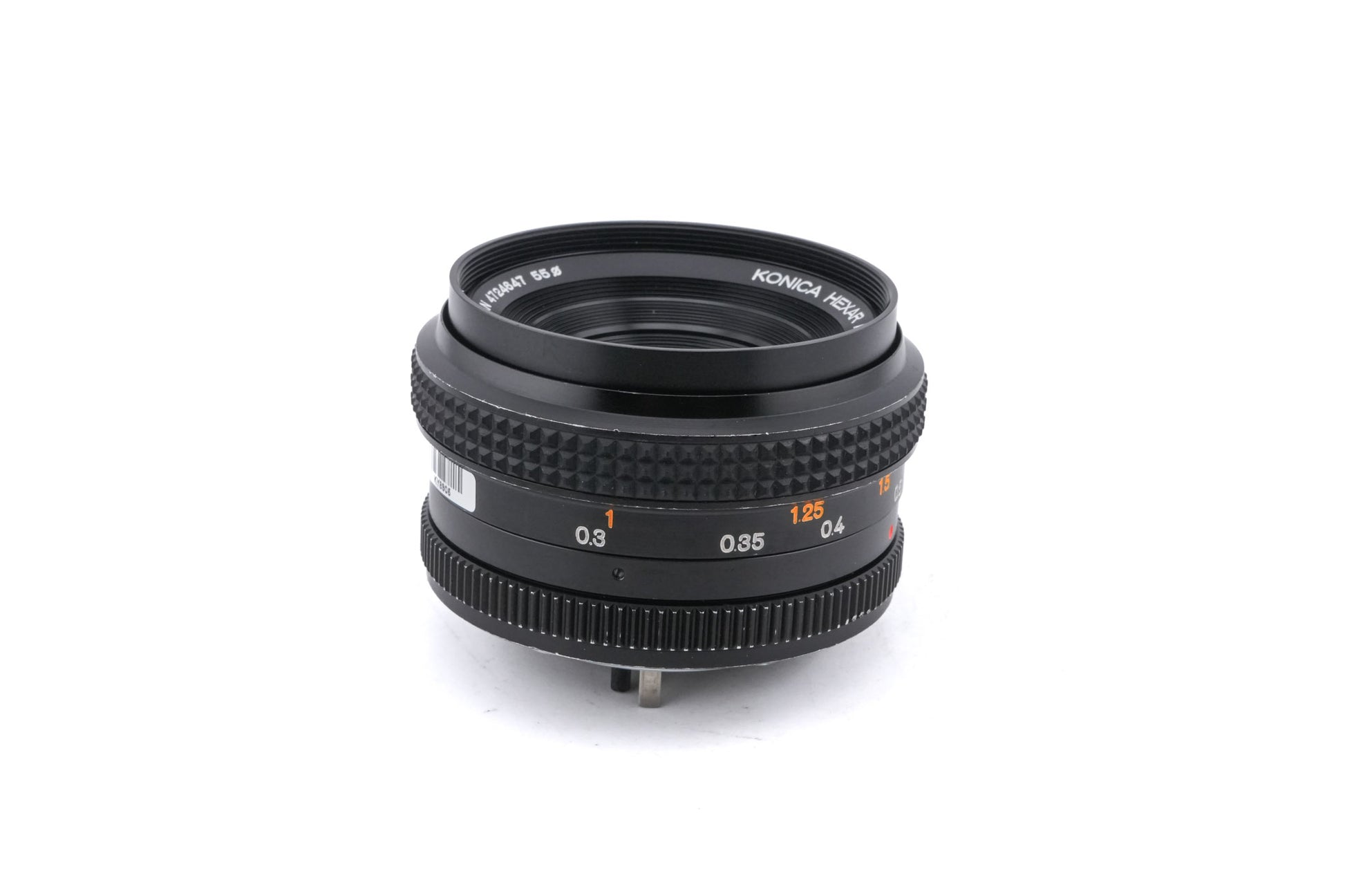 Manual focus wide angle lens made for AR mount SLR cameras by Konica starting in 1975. This is the newer version, with rubber focus grip. Metal body available in black.
