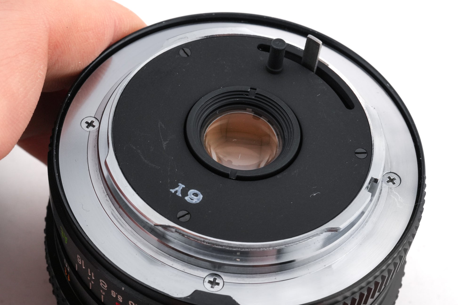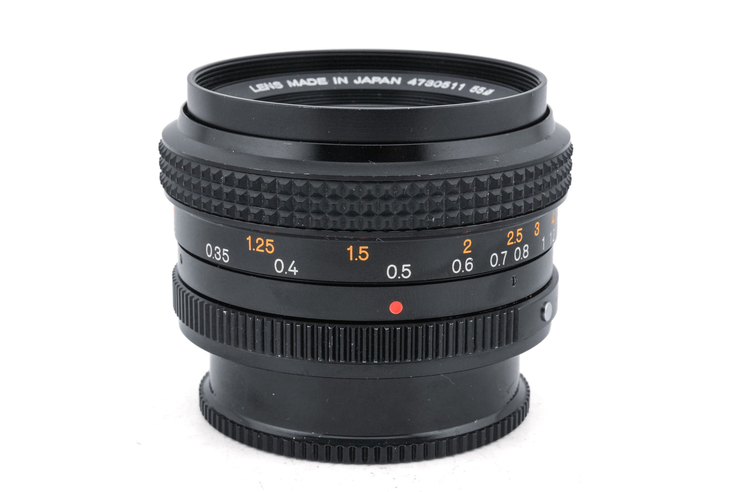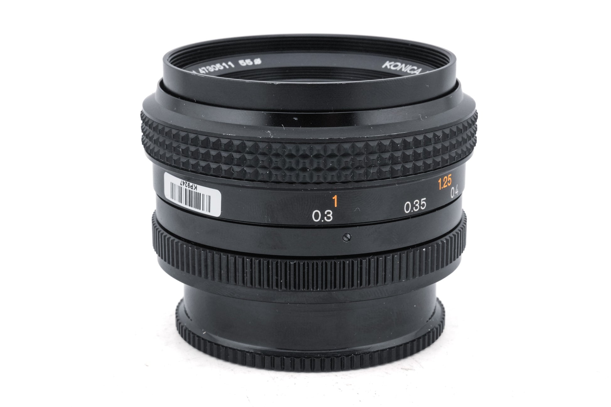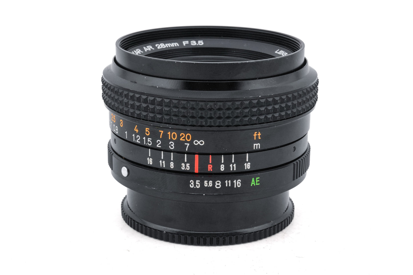Manual focus wide angle lens made for AR mount SLR cameras by Konica starting in 1975. This is the newer version, with rubber focus grip. Metal body available in black.