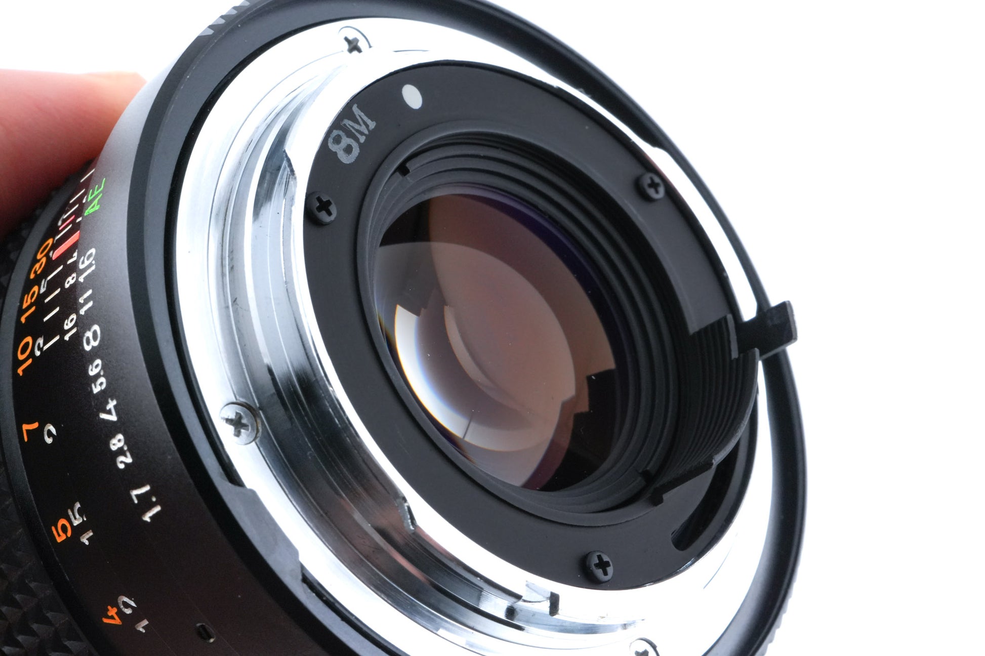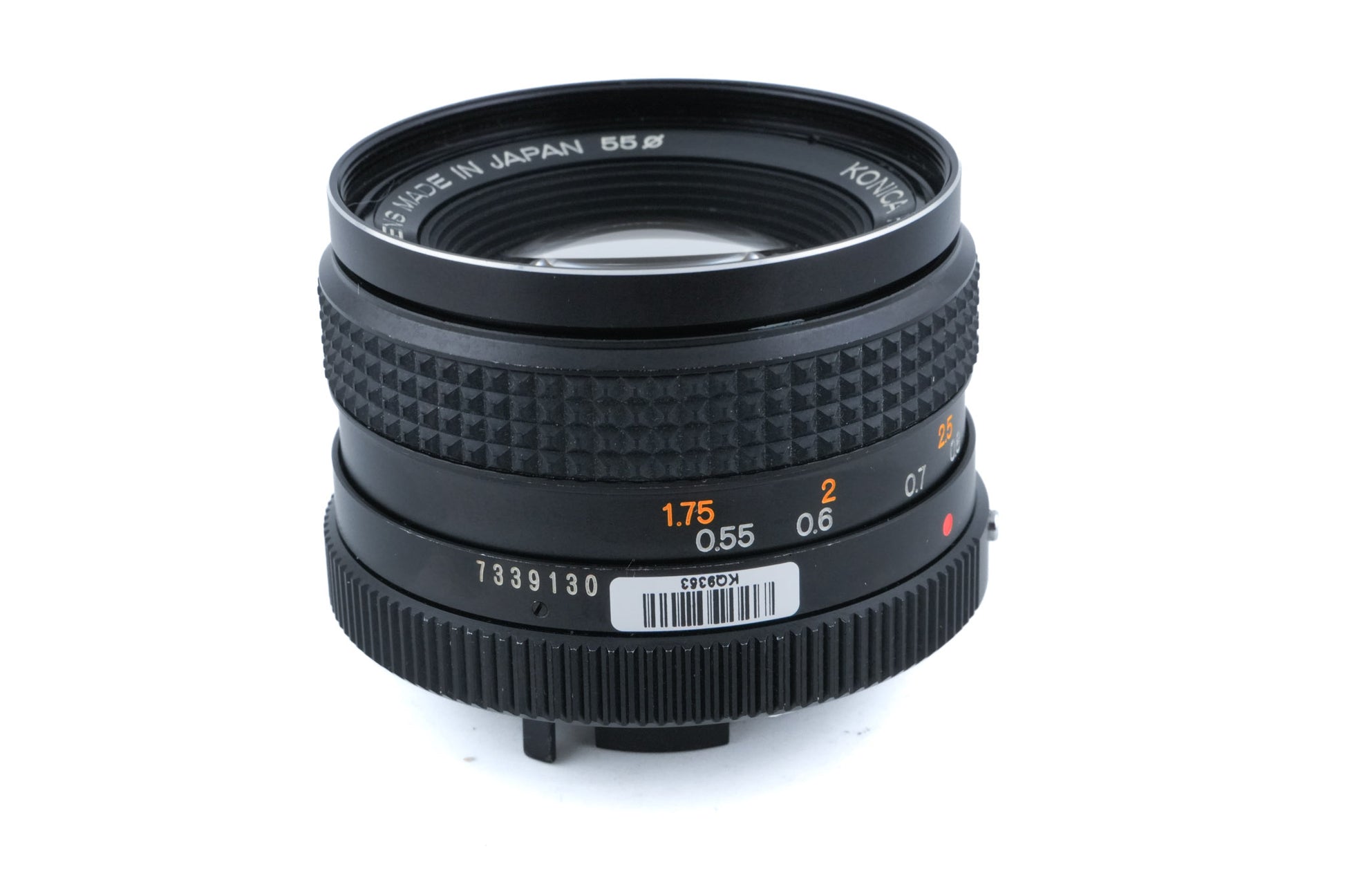 Manual focus lens made for AR-mount 35mm SLRs by Konica in 1973. It was originally sold together with the Autoreflex T3. Metal body available in black.