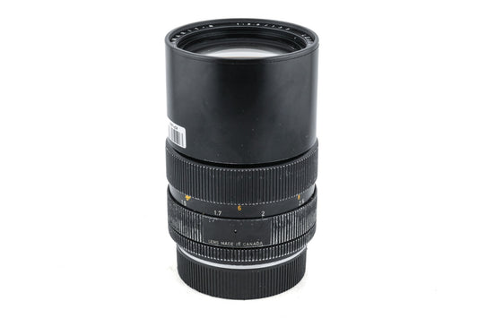 Manual focus telephoto lens made for R-mount 35mm SLR cameras introduced by Leica in 1968. Leica made two versions of this lens. This is the second version that has a convex rear element; on the first version, the element is concave. Both versions use the same body but experience minor discrepancies in engravings. It has a built-in lens hood. This lens has a 3-Cam mount. 3-Cam lenses have two sloped cams and a third stepped cam and are compatible with all Leicaflex and R-series cameras. At serial number 2771419, the filter mount changed from Series VII to E55 filters, and the lens became compatible with the Elpro 3 and 4 close-up attachments. The lens was manufactured in Canada. Metal body available in black (11211).