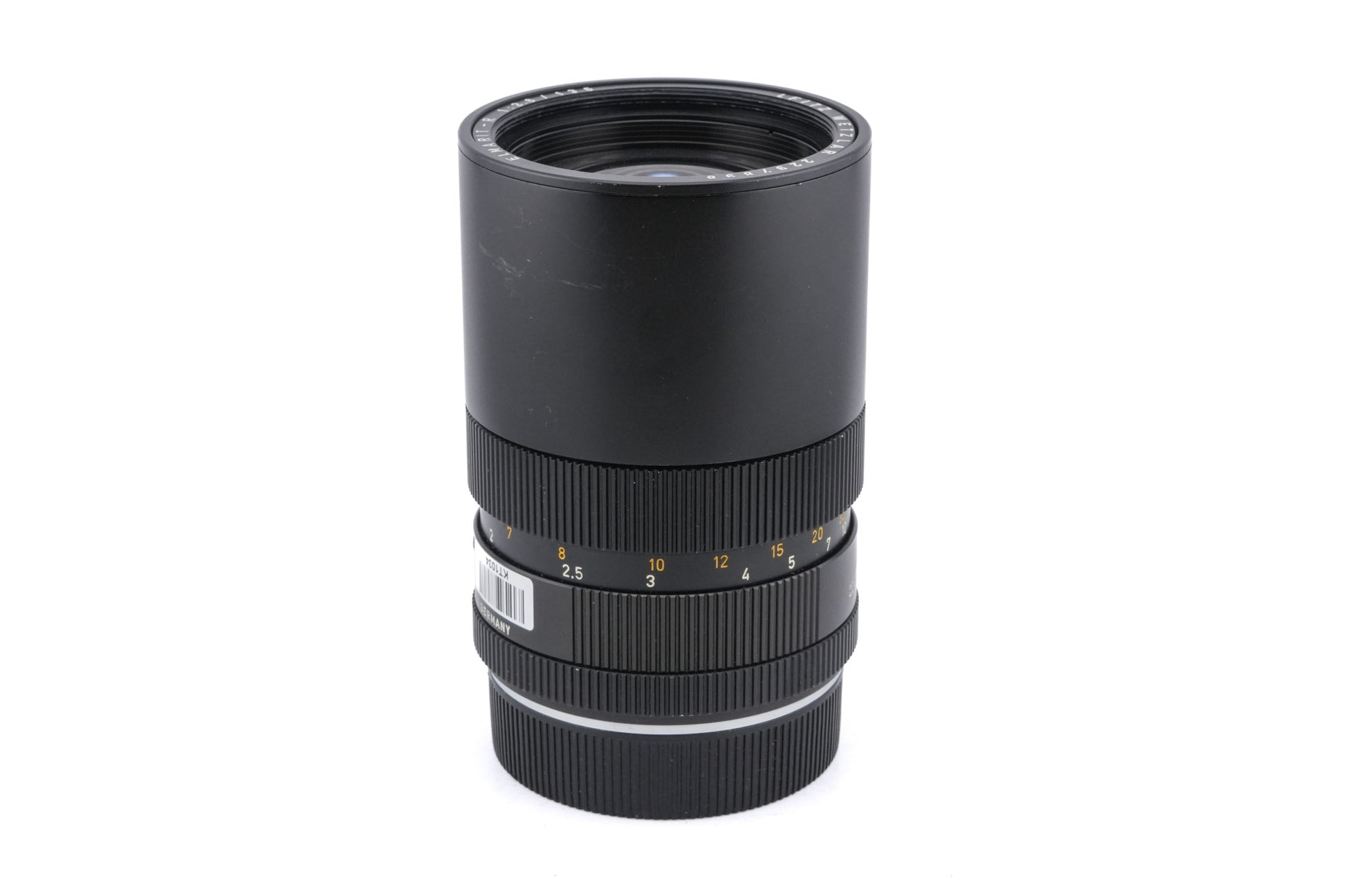 Manual focus telephoto lens made for R-mount 35mm SLR cameras introduced by Leica in 1964. Leica made two versions of this lens. This is the first version that has a concave rear element; on the second version, the element is convex. Both versions use the same body but experience minor discrepancies in engravings. It has a built-in lens hood. This lens has a 2-Cam mount. 2-Cam lenses have two sloped cams and are compatible with the standard Leicaflex and R-series cameras in stop-down metering mode only. They are not recommended to be used on the R8/R9. The lens was manufactured in both Germany and Canada. Metal body available in black (11211).