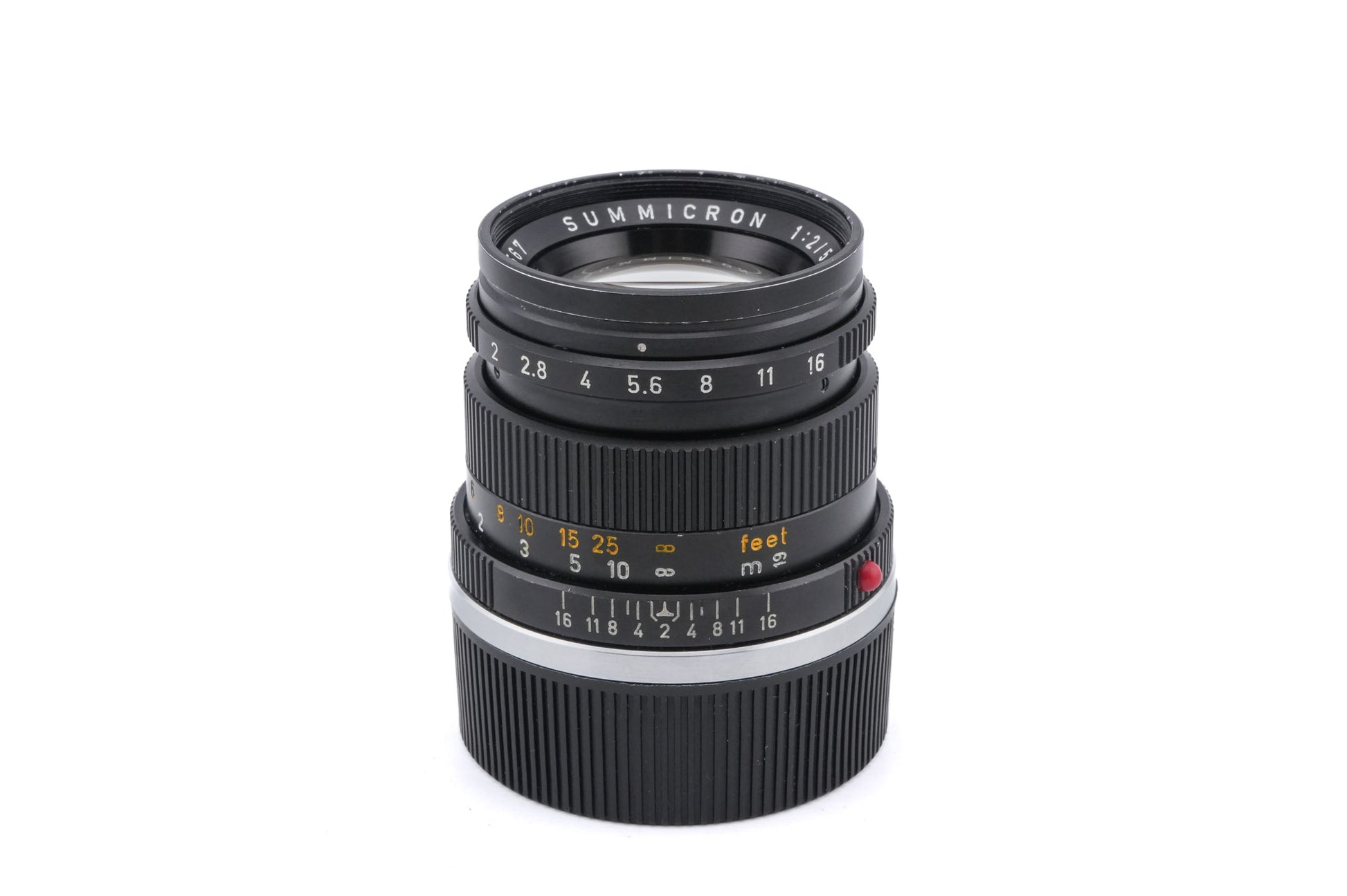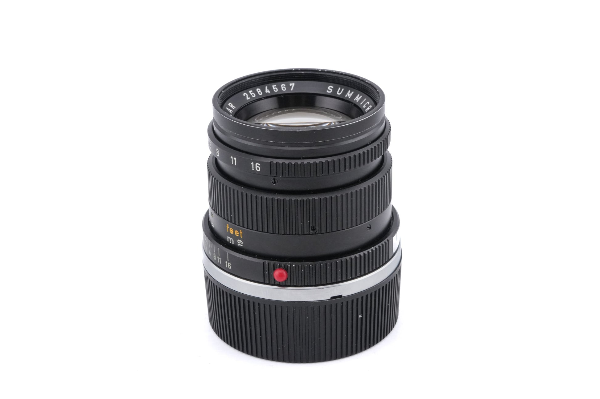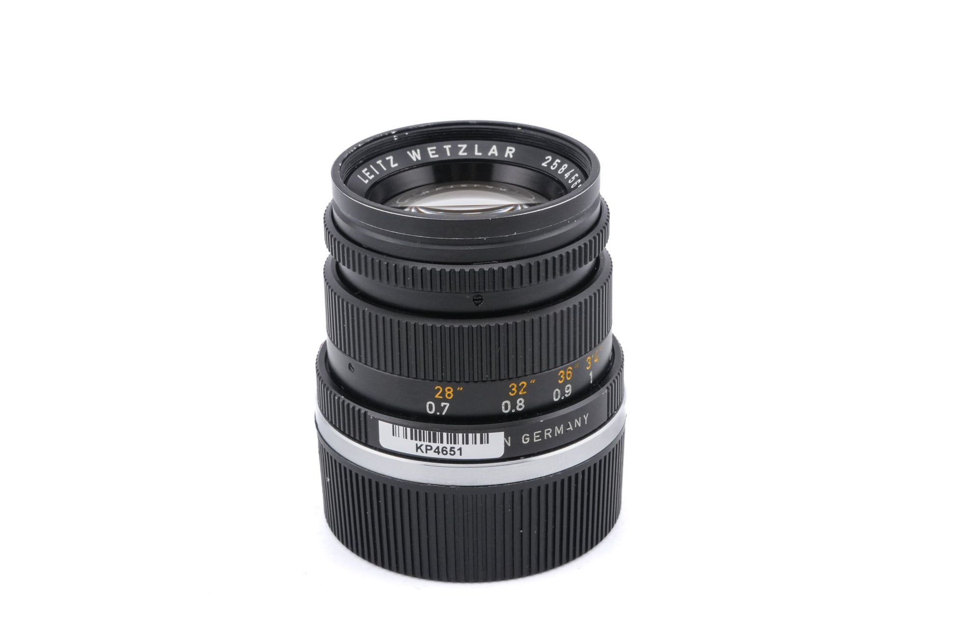 Manual focus normal lens made for M-mount rangefinder cameras introduced by Leica in 1969. Leica made many different versions of the 5cm f2 Summicron that differ in both design and optical formula. This is the third model of the lens. The optical formula changed from 7 elements to 6, and it was advertised as a lightweight version without the infinity lock on the focusing mount. The early examples still have the scalloped focusing ring as seen on the previous versions, but later examples changed to a finer, even knurling. Metal body available in black (11817).