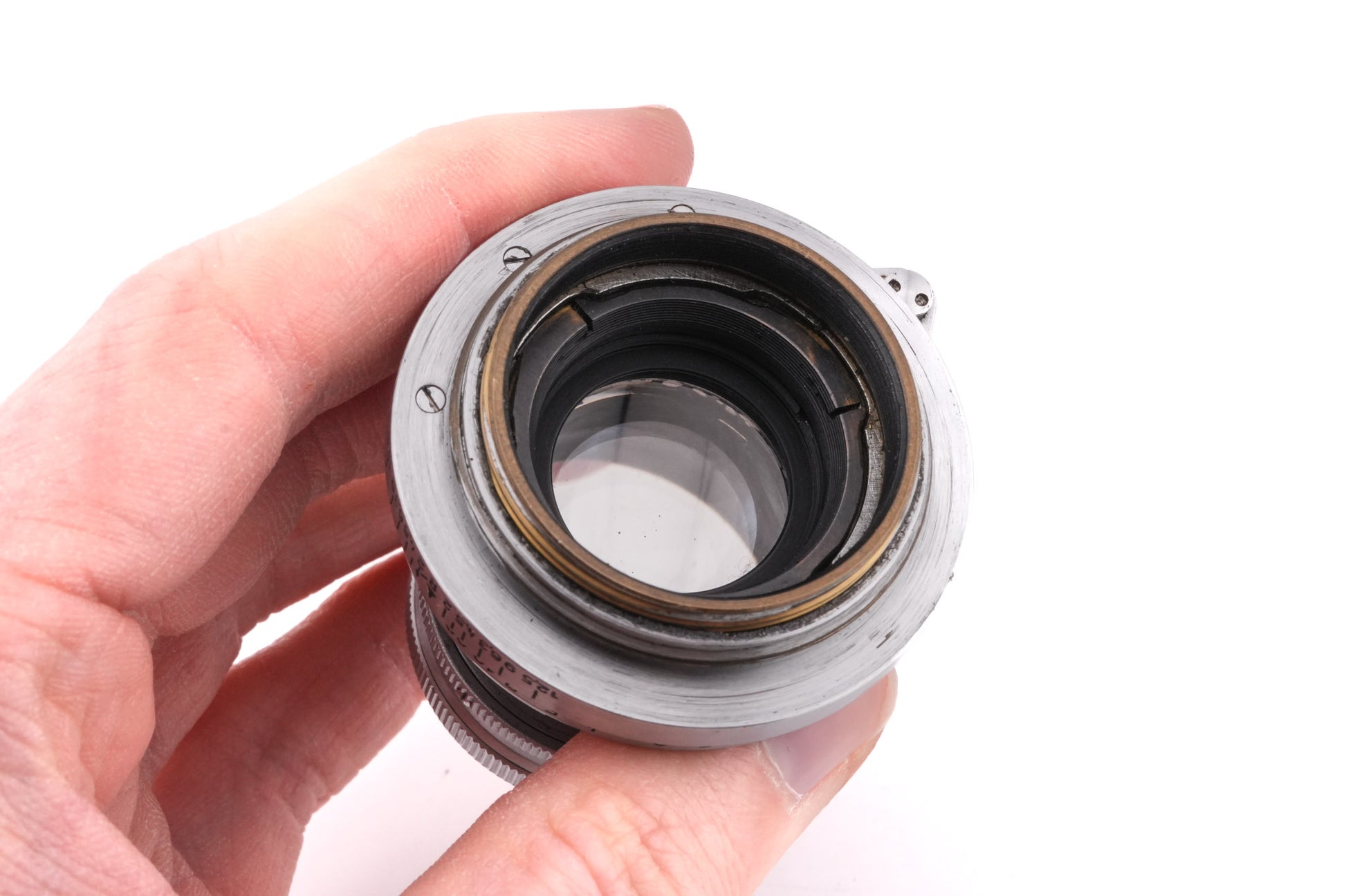 Manual focus collapsible normal lens made for M39 rangefinder cameras by Leica starting in 1932. Made with a focusing scale either in feet or meters. About 127,000 copies were made from 1932 to 1940, some with brass lens barrels and some with aluminum. Metal body available in silver.