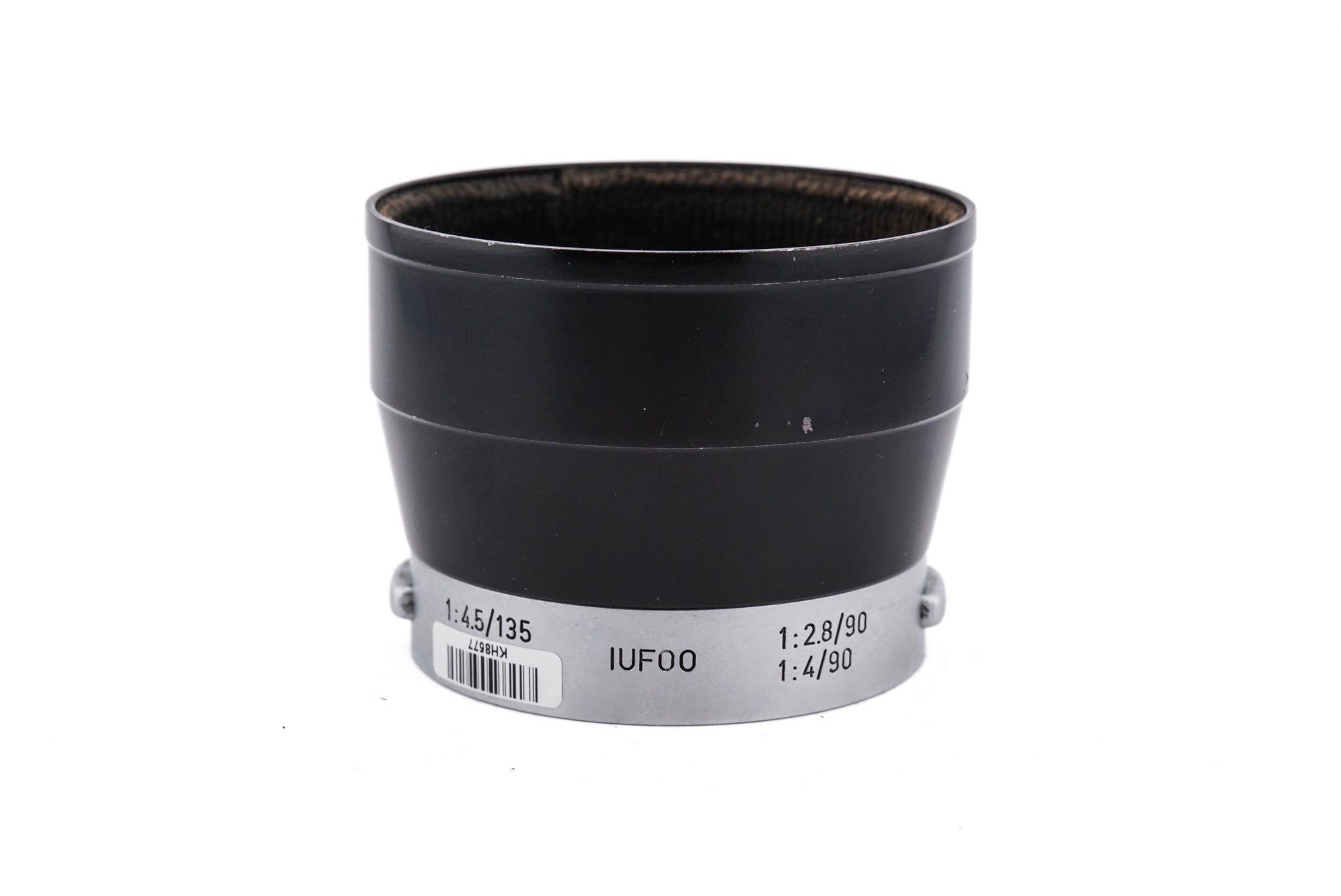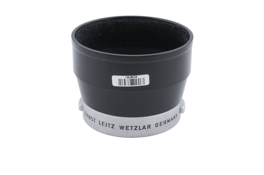 Lens hood made for various M/M39 mount telephoto lenses by Leica. Compatible lenses include the 135mm f4.5, 90mm f2.8, and 90mm f4. Metal/plastic construction in black and silver grey finish.