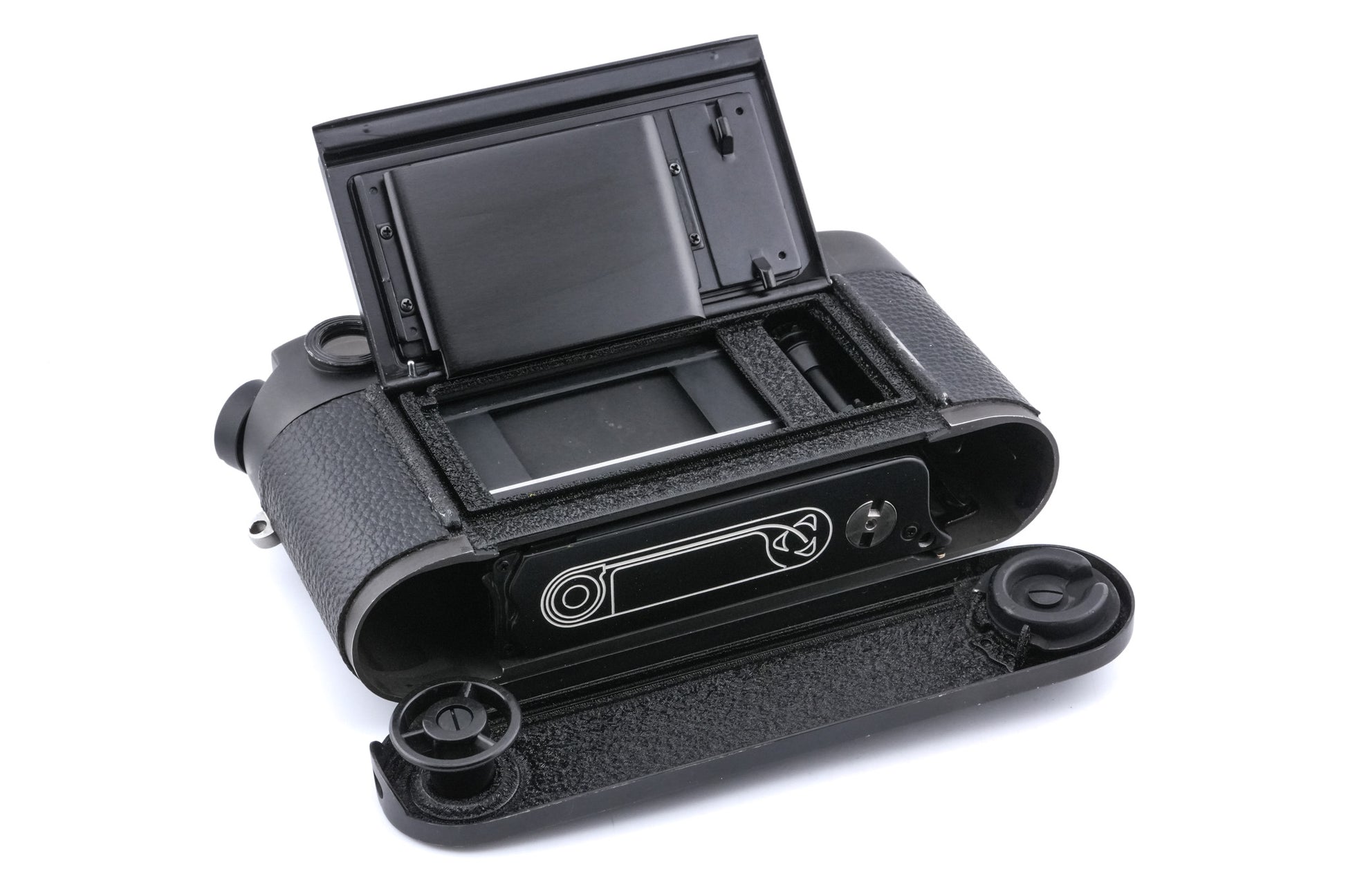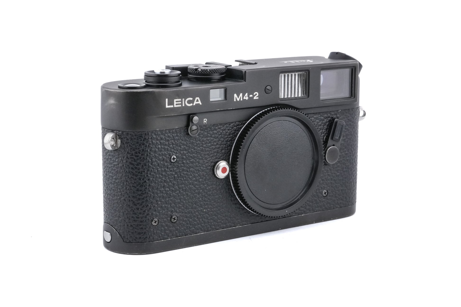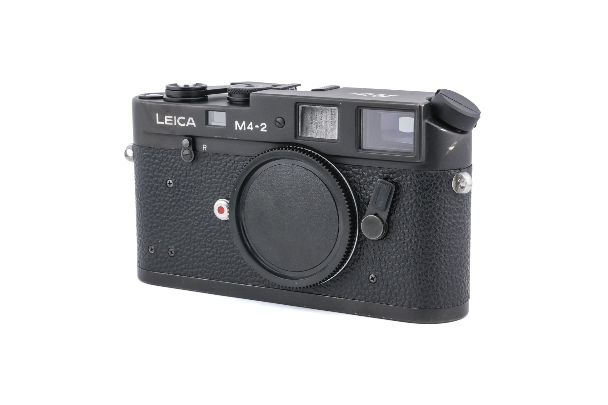 Manual focus M-mount 35mm rangefinder camera released by Leica in 1978. The M4-2 is manufactured entirely by Leitz Canada. It is similar to the M4 but lacks the self-timer, has a hot shoe, and is designed to accept a motor winder. It has a finder magnification of 0.72x and frame lines for 35mm, 50mm, 90mm, and 135mm lenses. The M4-2 experienced many variations in the type and placement of engravings over the production period. Metal body available in black (10410).