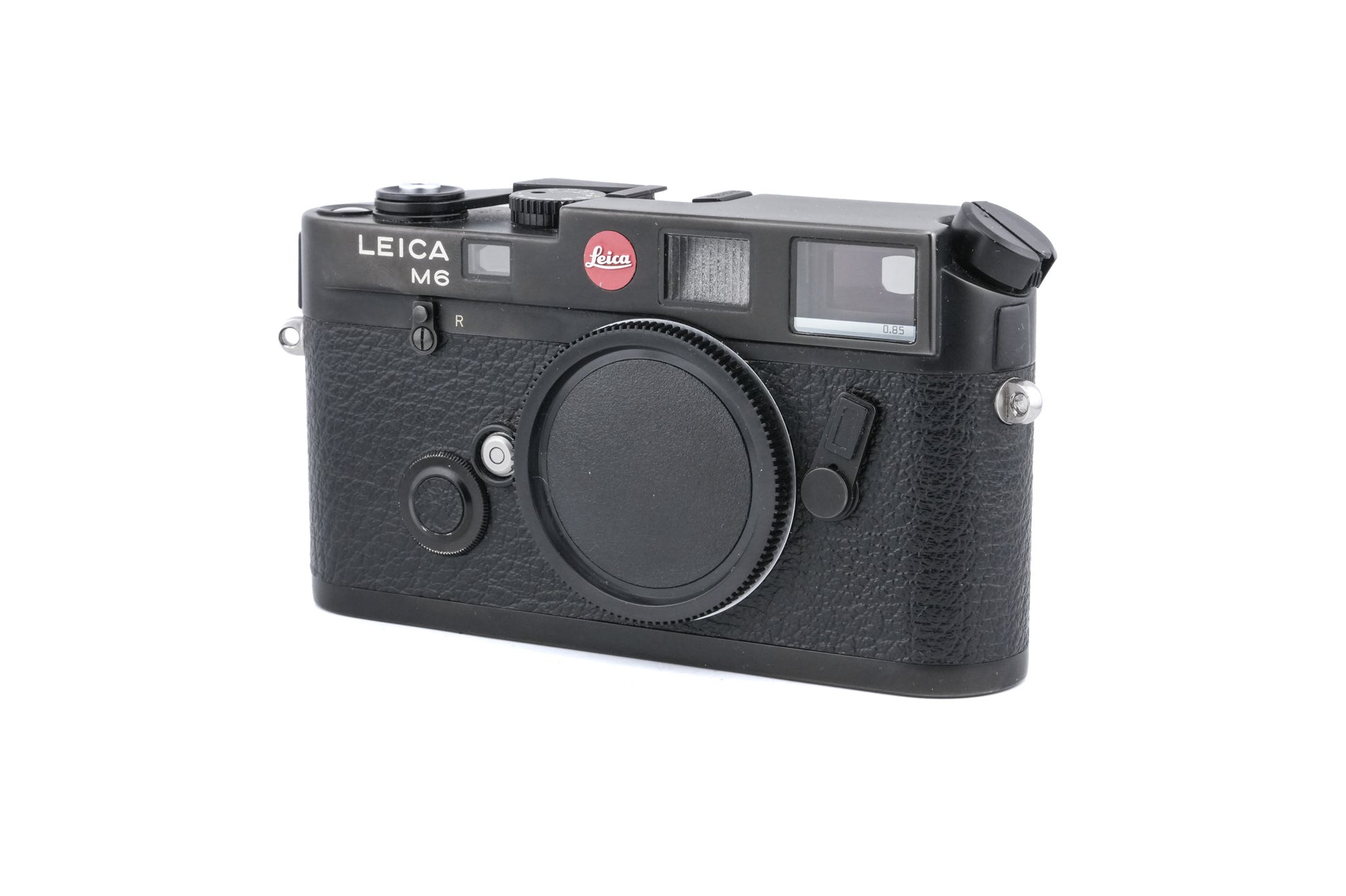 Manual focus M-mount 35mm rangefinder camera introduced by Leica in 1997. The M6 is similar to the M4-P but adds through-the-lens metering. The top cover was changed to a zinc casting making the M6 stronger than the previous M series cameras. At launch, the M6 was only available with a 0.72x viewfinder. This model from 1997 introduced a 0.85x viewfinder making it more suited for lenses 50mm or longer. This change also removed the 28mm framelines. The 0.85x M6 has framelines for 35/135mm, 50/75mm, and 90mm in the viewfinder and was only available in black. Metal body available in black (10413).