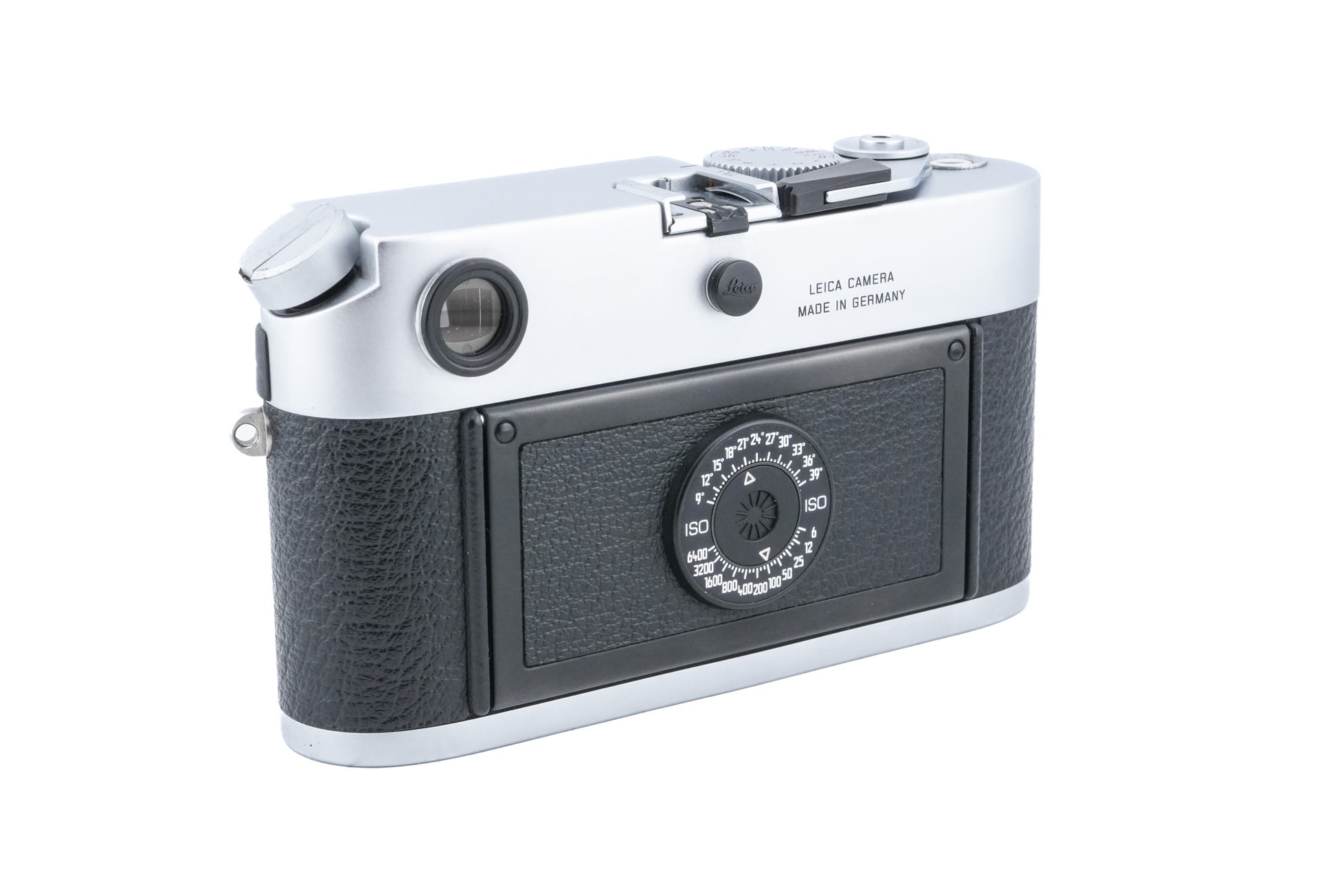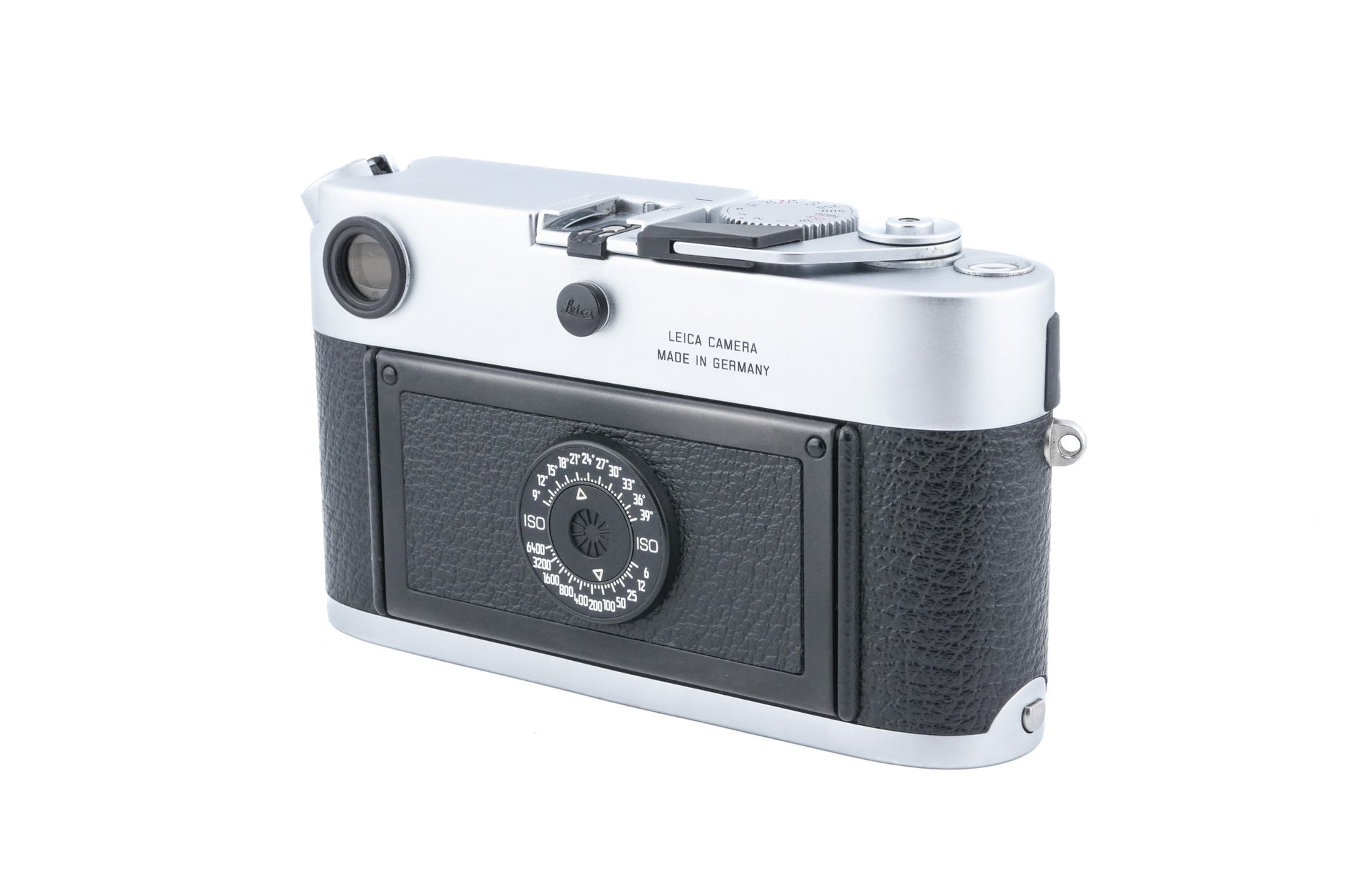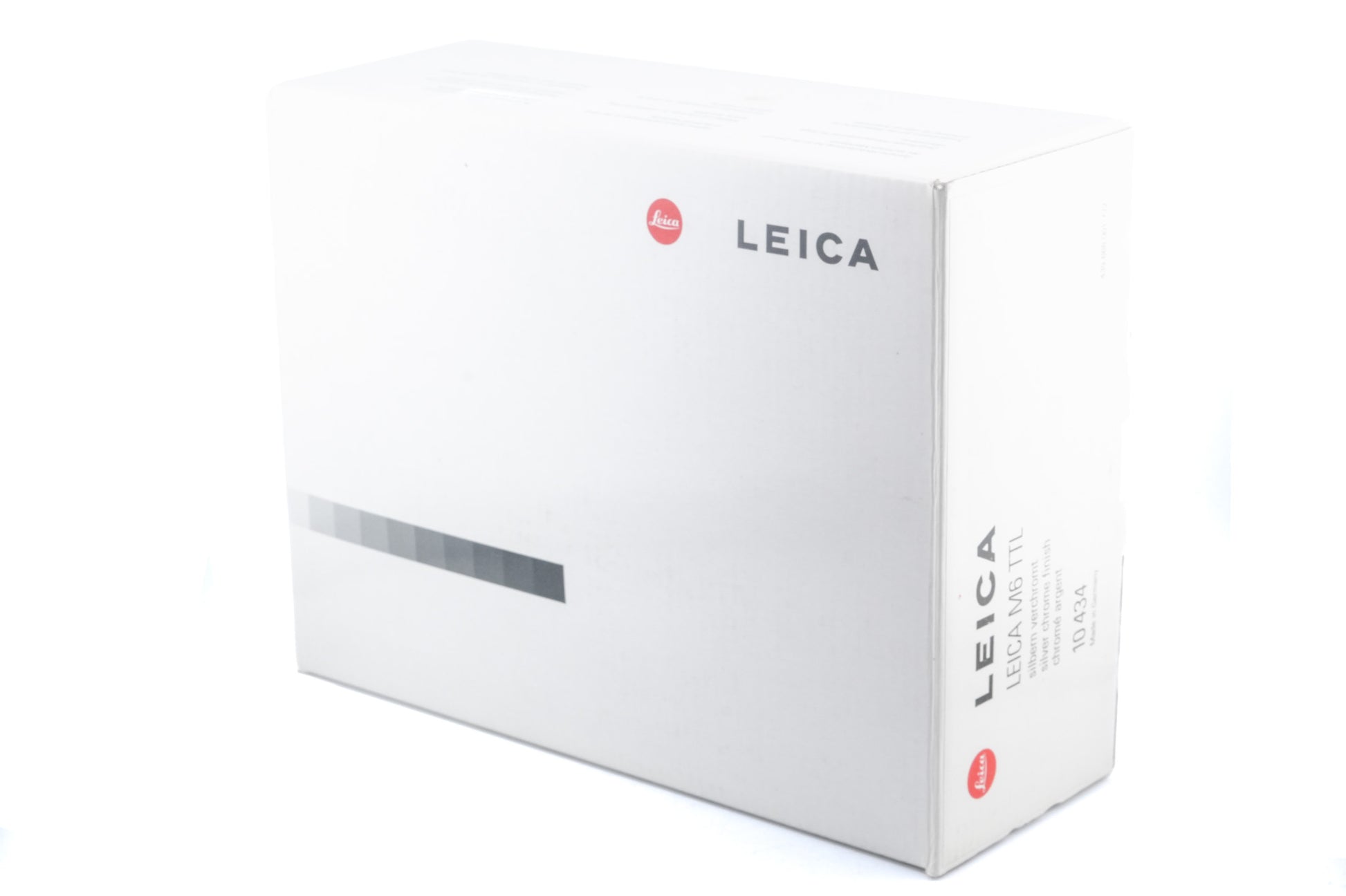 Manual focus M-mount 35mm rangefinder camera introduced by Leica in 1998. The M6 TTL introduced a new hot shoe, an auxiliary photocell for dedicated flash photography, and a larger shutter speed dial positioned further forward for improved ergonomics. It is otherwise similar to the original M6 from 1984. At launch, it was available in two configurations: a 0.72x viewfinder (framelines for 28/90mm, 35/135mm, and 50/75mm) and a 0.85x viewfinder (framelines for 35/135mm, 50/75mm, and 90mm). Metal body available in silver (10434).