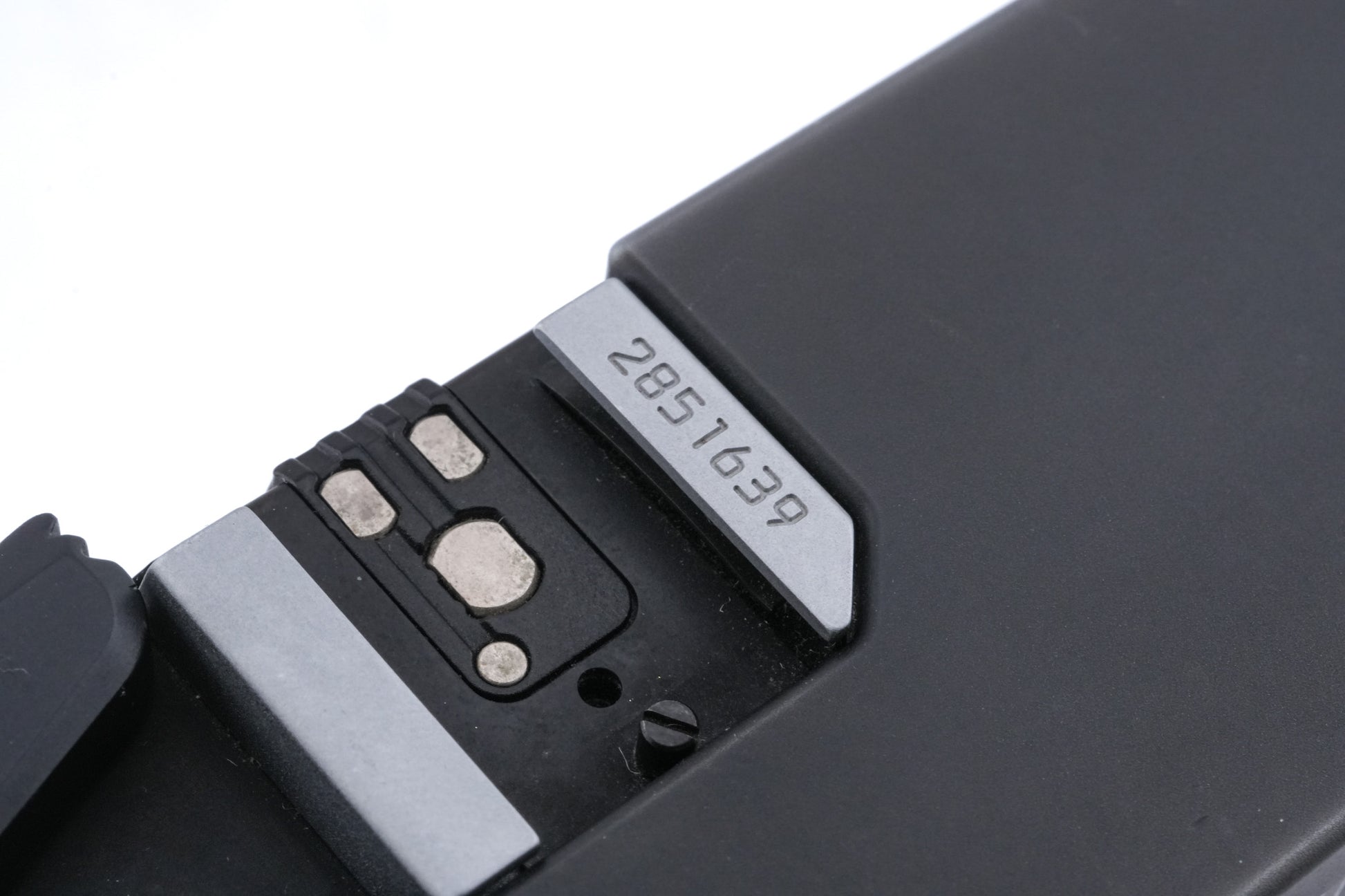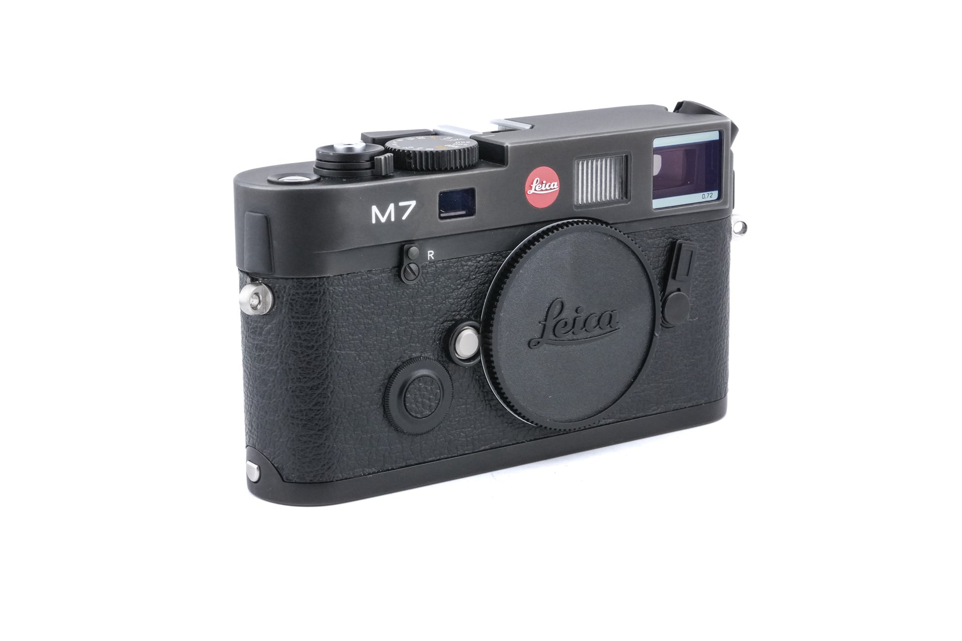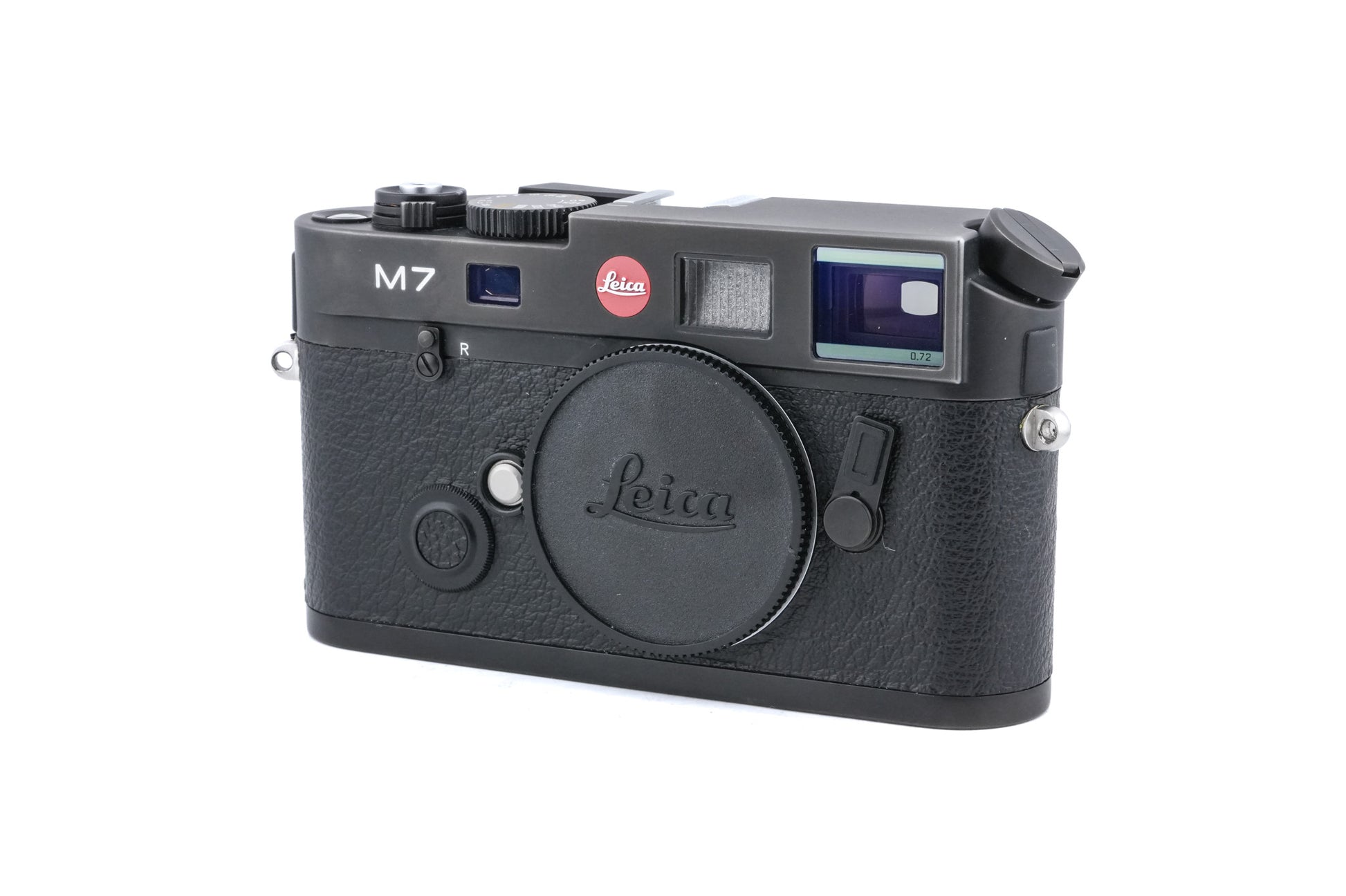 Manual focus M-mount 35mm rangefinder camera introduced by Leica in 2002. The M7 is similar to the M6 in appearance, but it added an electronic shutter control with automatic aperture priority. It has a circuit breaker switch around the shutter release button that also acts as a safety catch for the button itself. It was available in three configurations: a 0.72x viewfinder (framelines for 28/90mm, 35/135mm, and 50/75mm), a 0.58x viewfinder (framelines for 28/90mm, 35mm, and 50/75mm), and a 0.85x viewfinder (framelines for 35/135mm, 50/75mm, and 90mm). The 0.72x was available in black and silver, while the 0.58x and 0.85x were available in black only. The camera uses two CR1/3N lithium batteries. Metal body available in black (10503).
