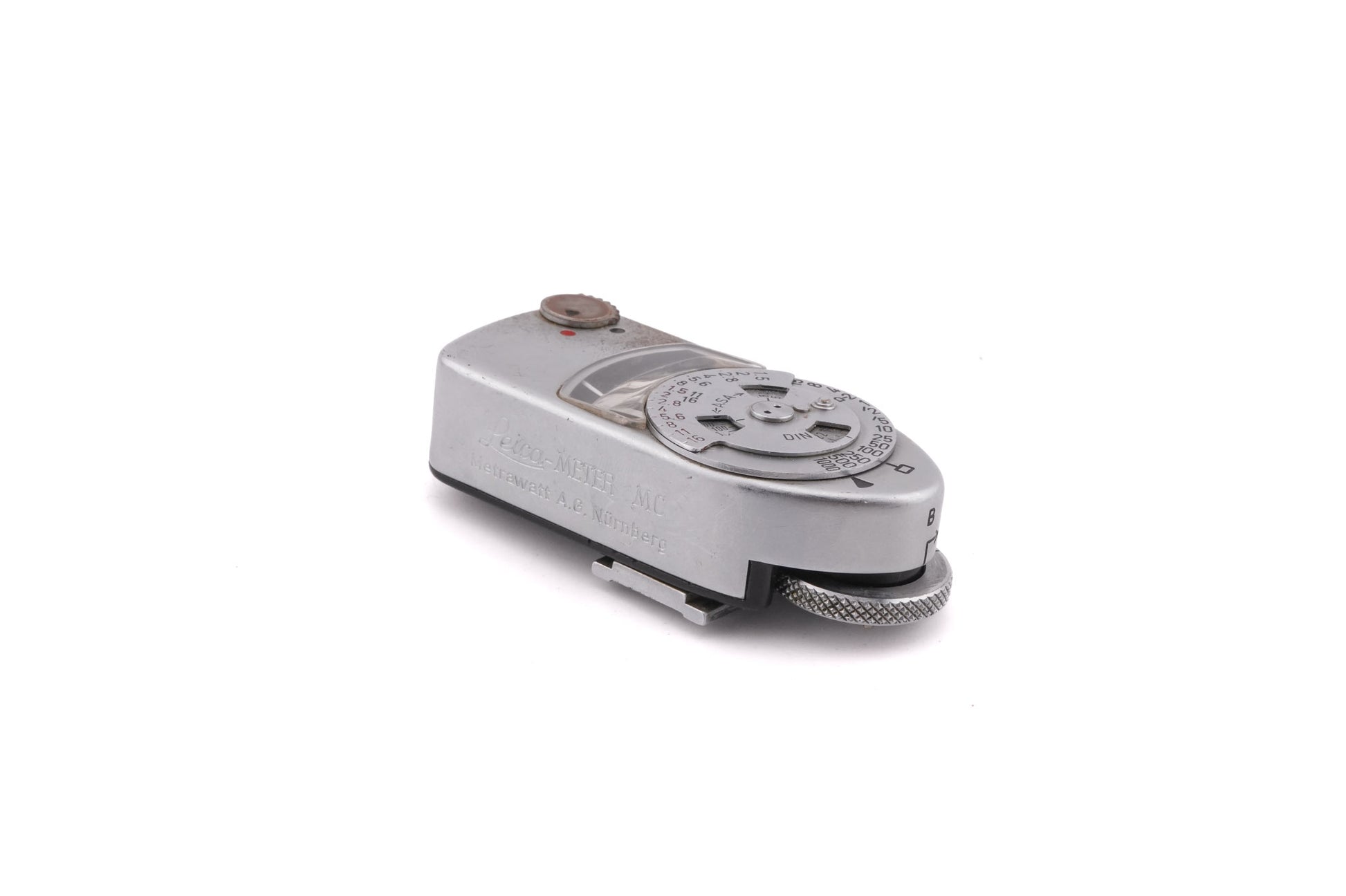 Shoe mount selenium light meter introduced for M mount rangefinders by Leica. It fits into the shutter speed dial of the Leica M3, M2, M1, and M4. Metal body available in silver.