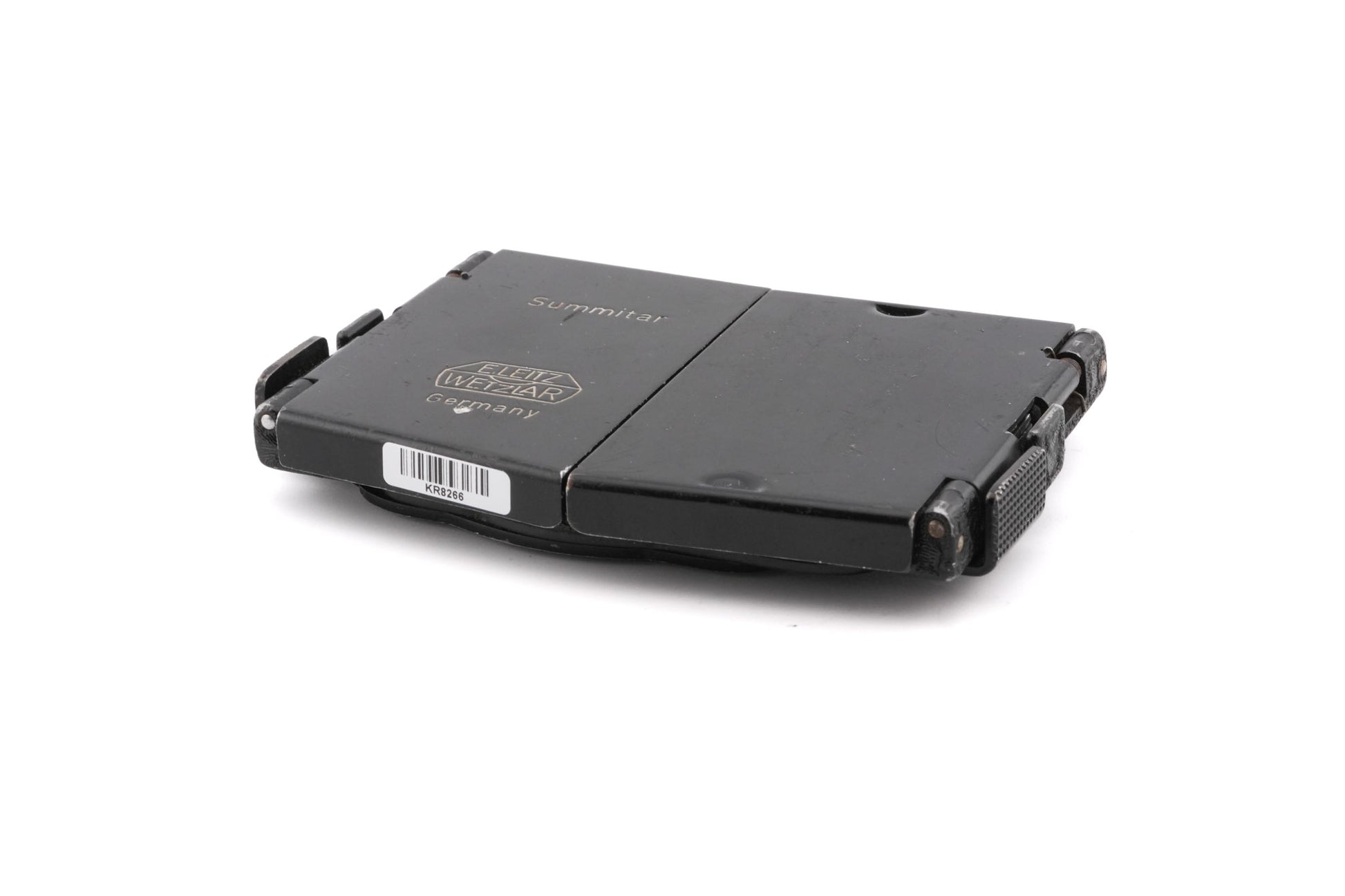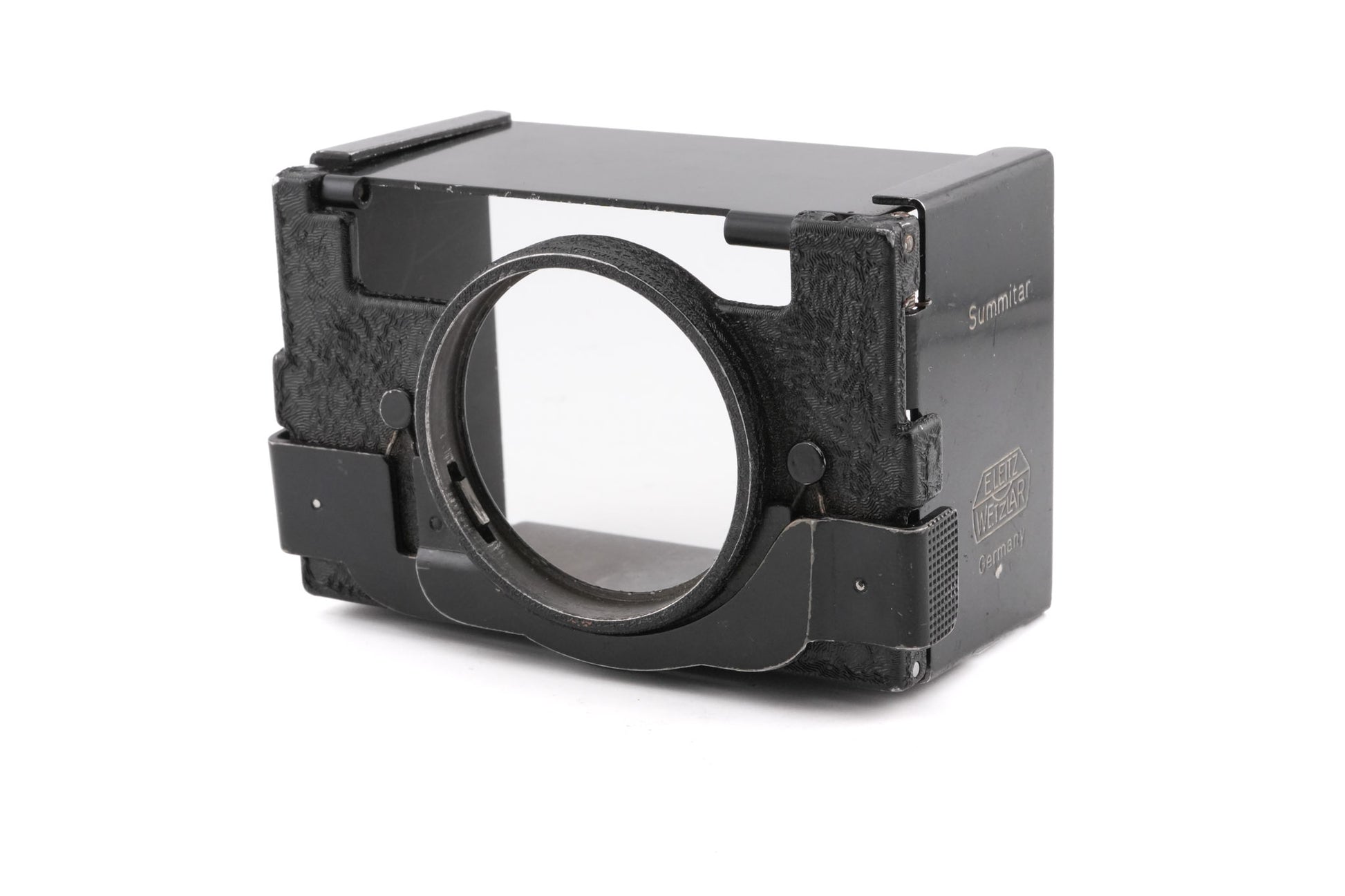 Collapsible "barn door" style lens hood for Leica Summitar 5cm f2 lenses. Older versions adjust via a tightening screw, later ones with button clamps. Later became the SOOFM hood that fits the Summicron as well. Metal body available in black.