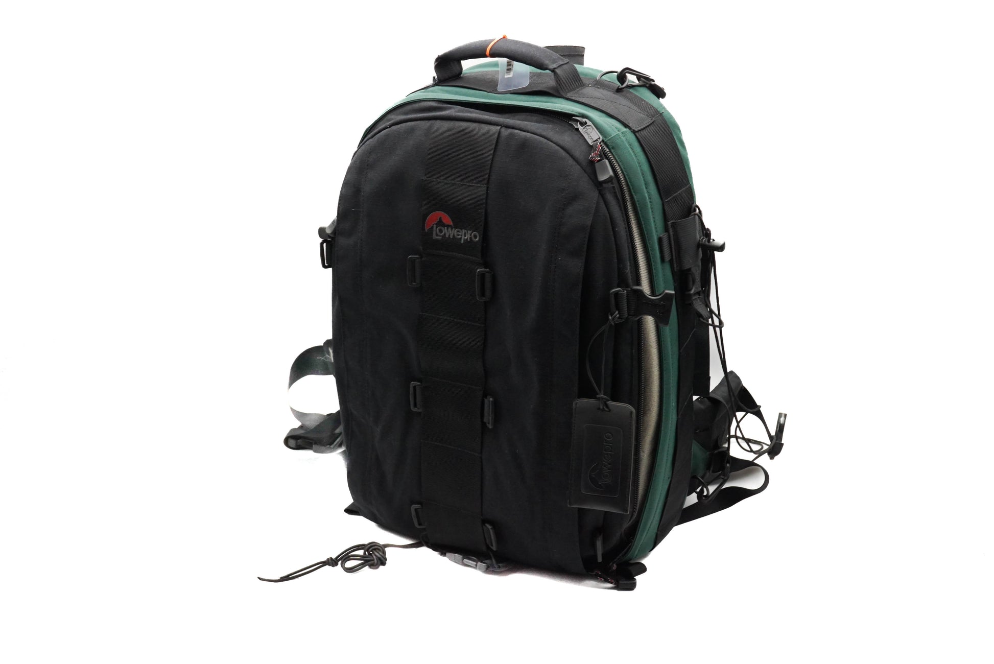 Backpack for camera bodies and lenses made by Lowepro. Fabric construction available in black.