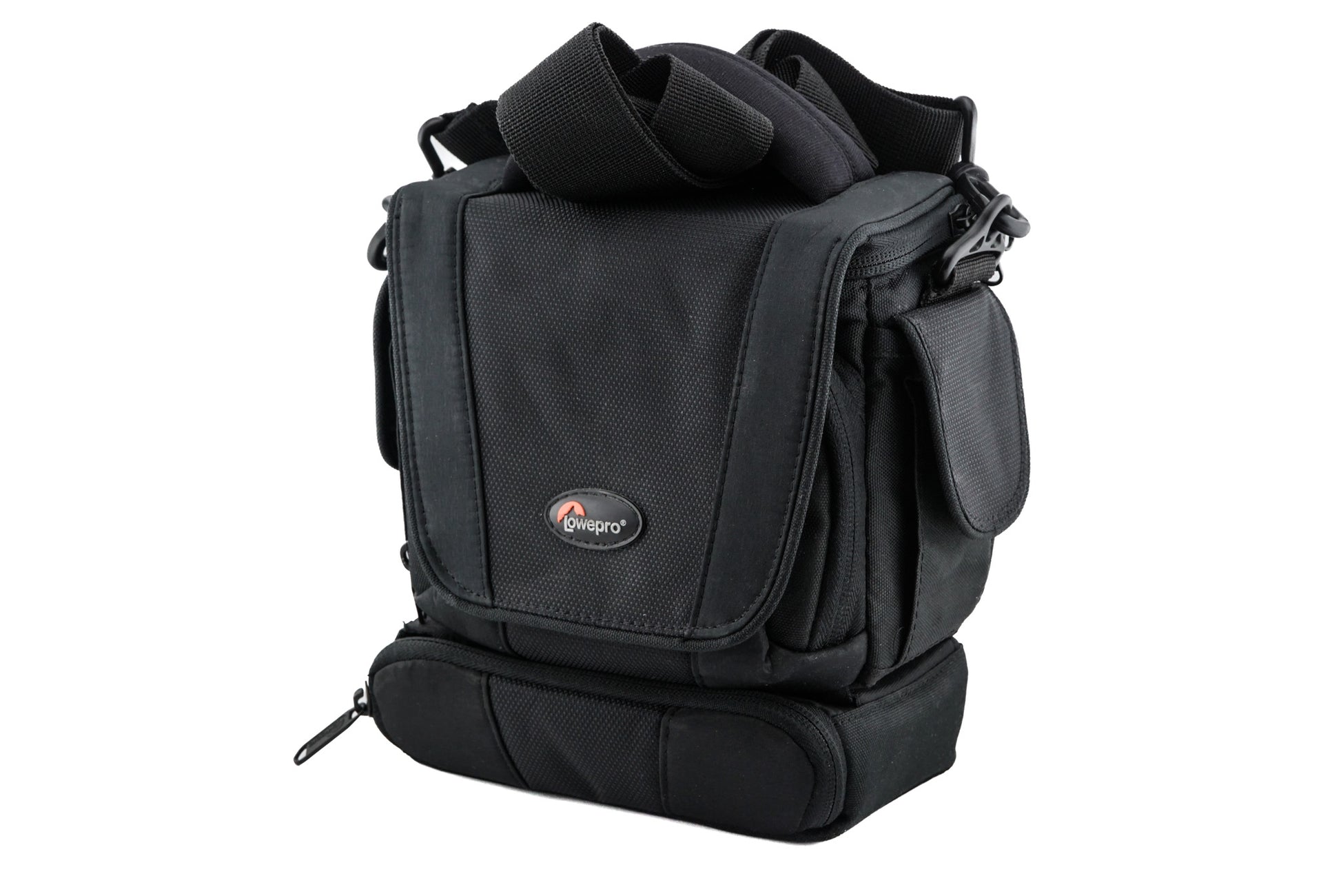 Shoulder bag made by Lowepro. Fabric body available in black.