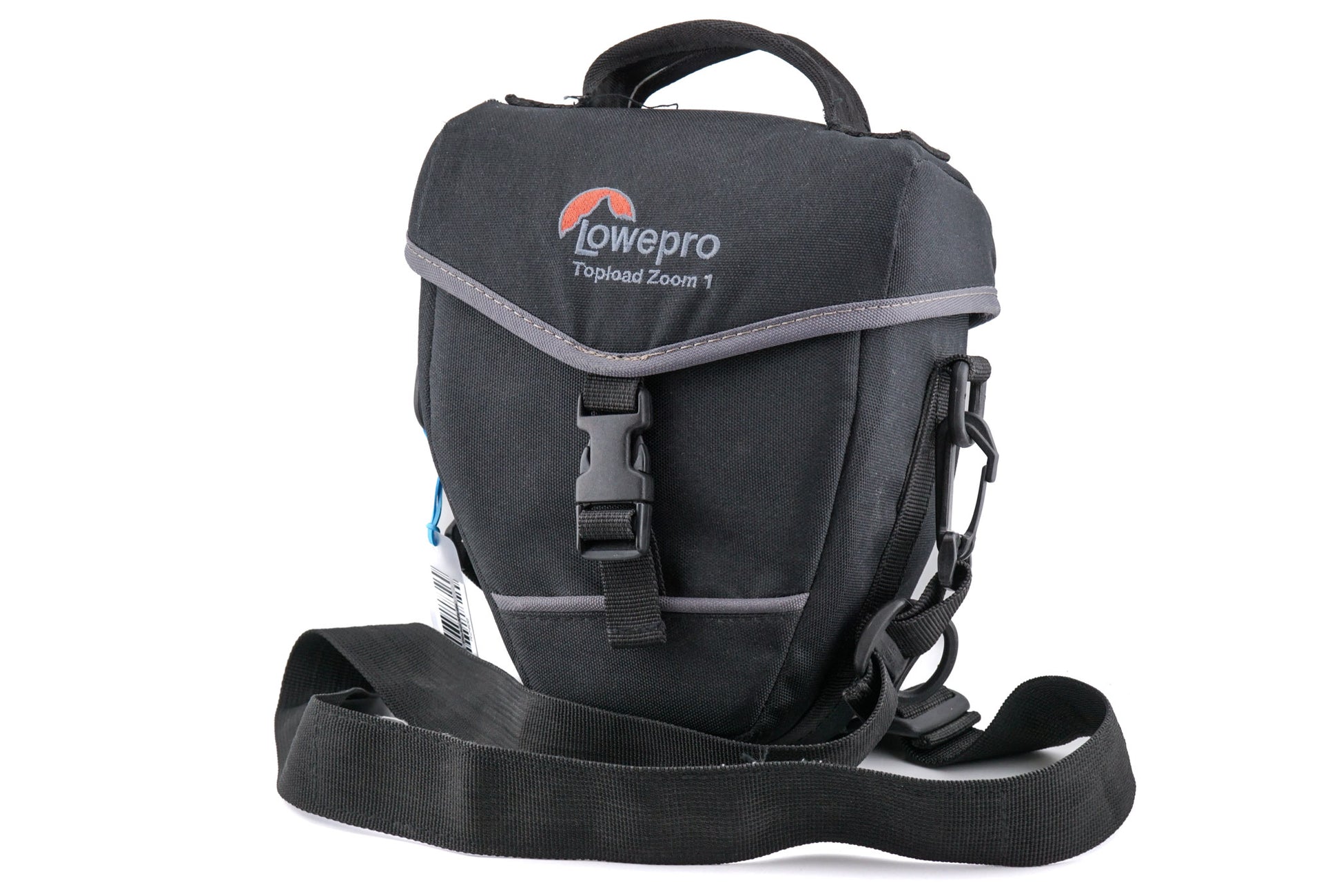 Shoulder camera bag made by Lowepro. It will fit one DSLR and one lens. Fabric body available in black.
