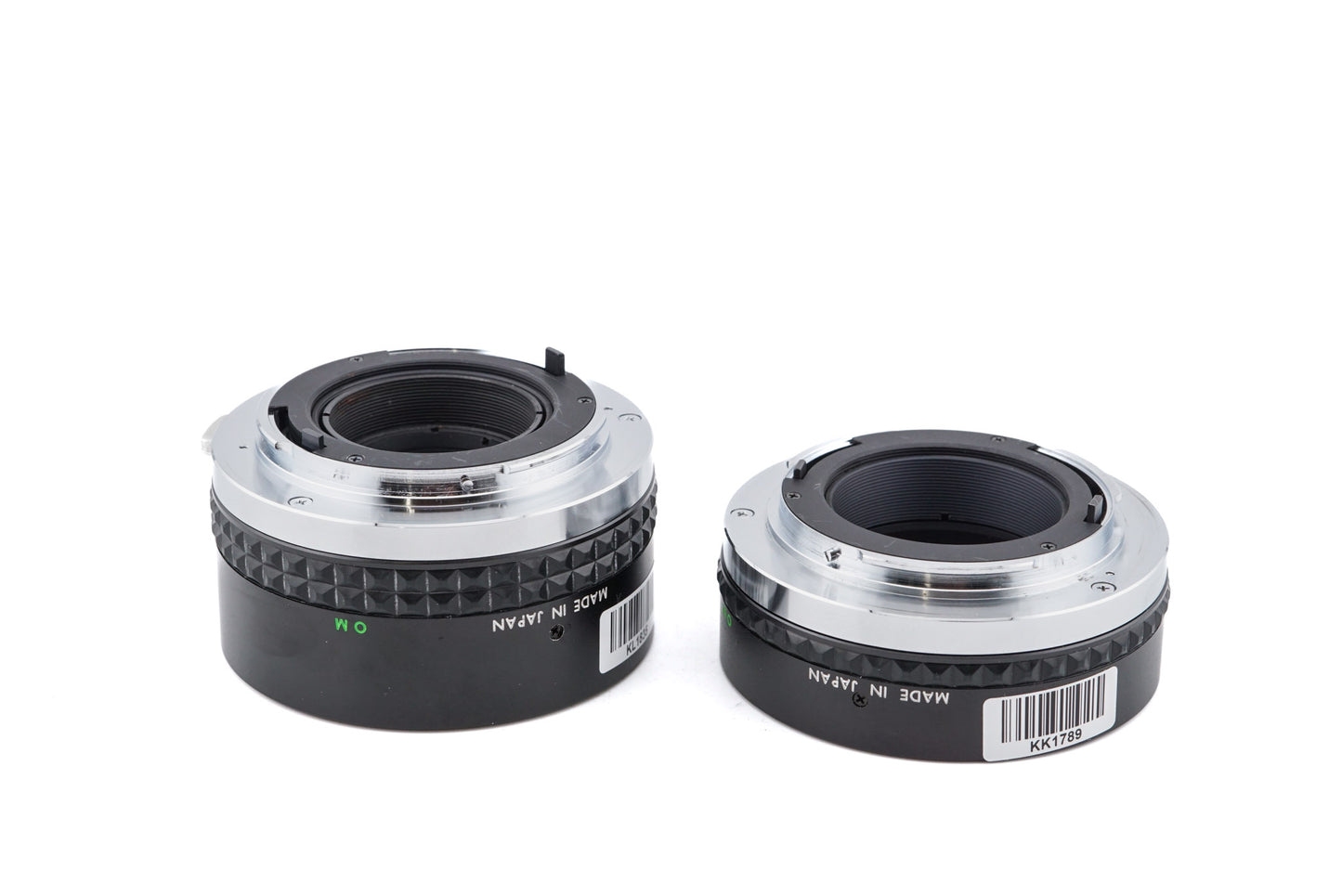 Extension tube made for Olympus OM-mount SLR cameras by Makinon. It has automatic aperture pass-through but only manual focus. Metal body available in black.