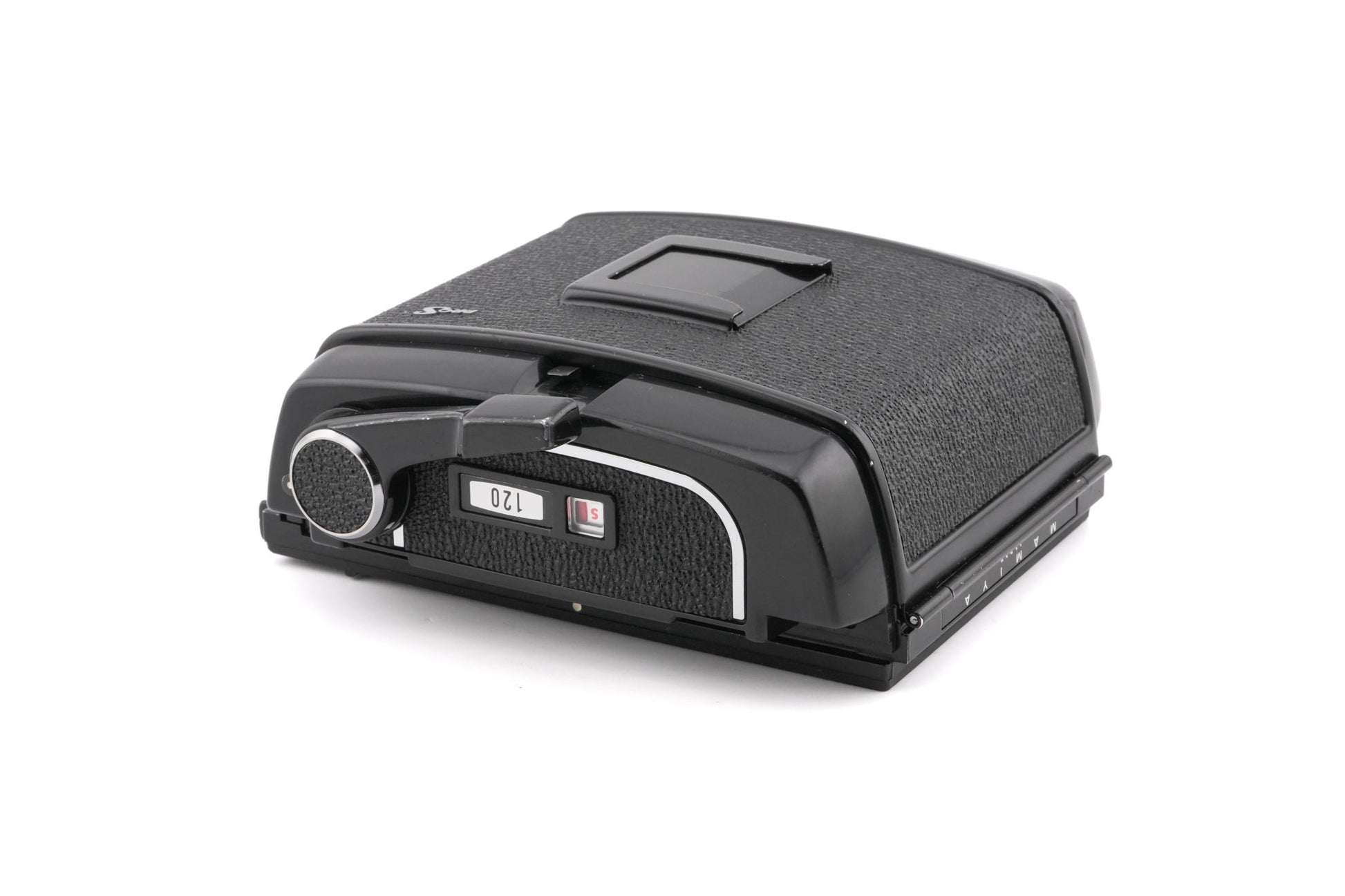 120 film back magazine made for the RB67 medium format cameras introduced by Mamiya. This is the second version announced together with the RB67 Pro-S in 1974. It added a multiple exposure lever under the film advance lever. It takes 10 6x7cm negatives on one roll of 120 film. Metal and plastic body available in black.