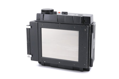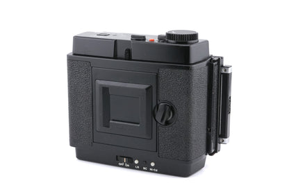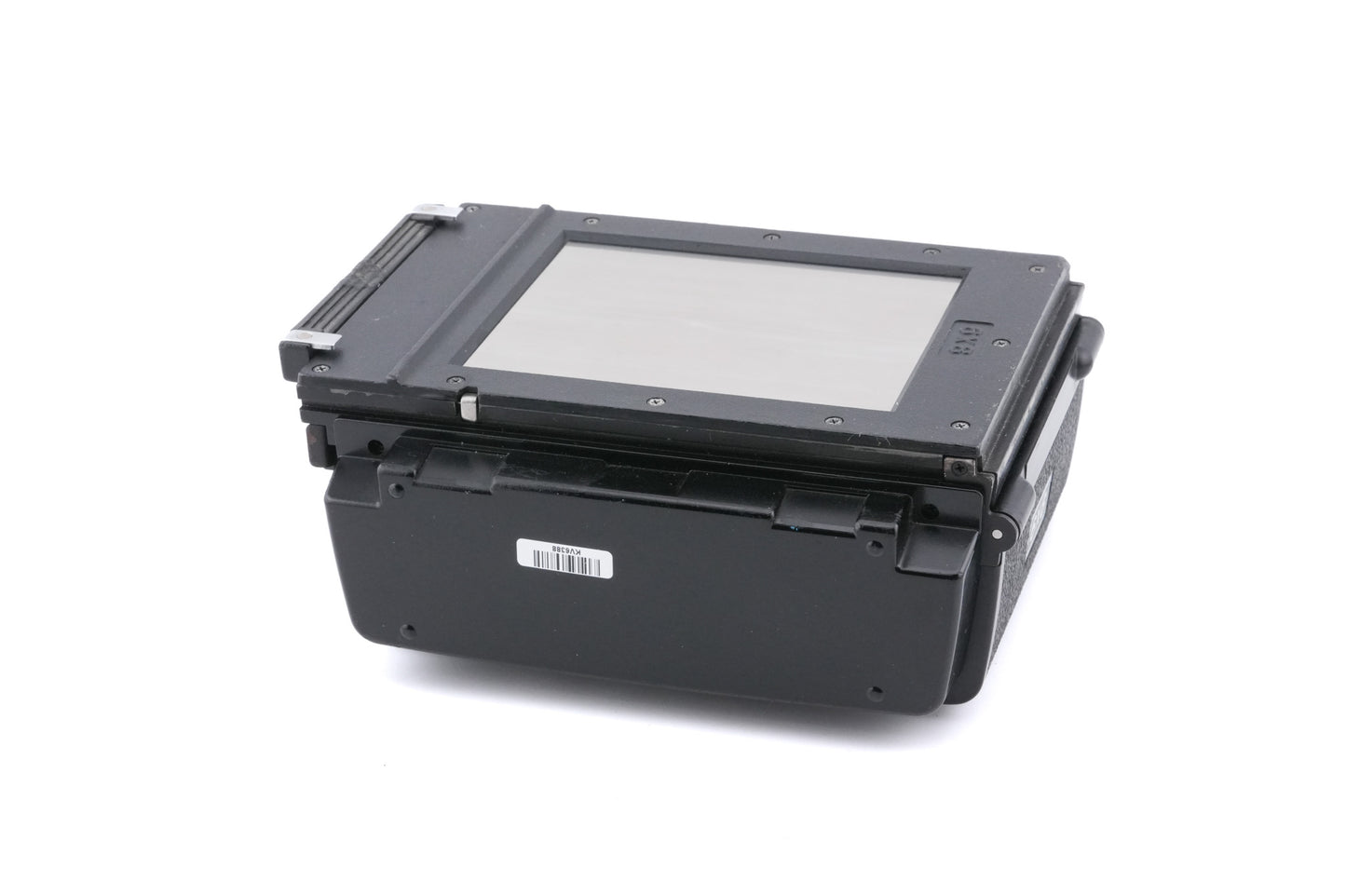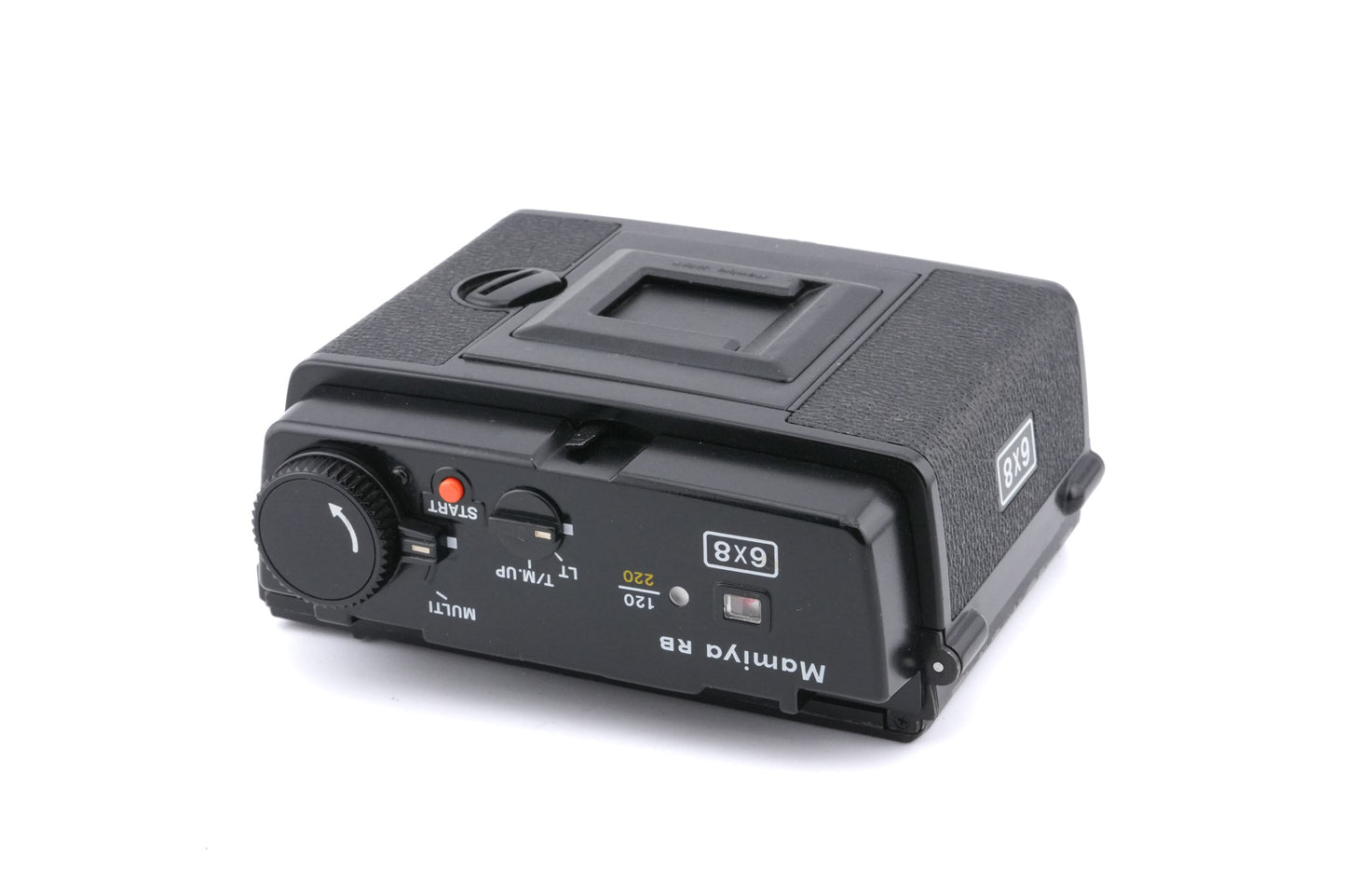 6x8 120 roll film back for Mamiya RB67 Pro-S/SD medium format SLR cameras. Not fully compatible with the RB67 Pro. Motorized film advance. Requires a 6x8 light baffle and a Pro-SD 6x8 revolving adapter to work as designed. Additionally 6x8 matte screen is used to get a full view on the finder. Supports both 120 and 220 formats. Plastic construction in black finish.