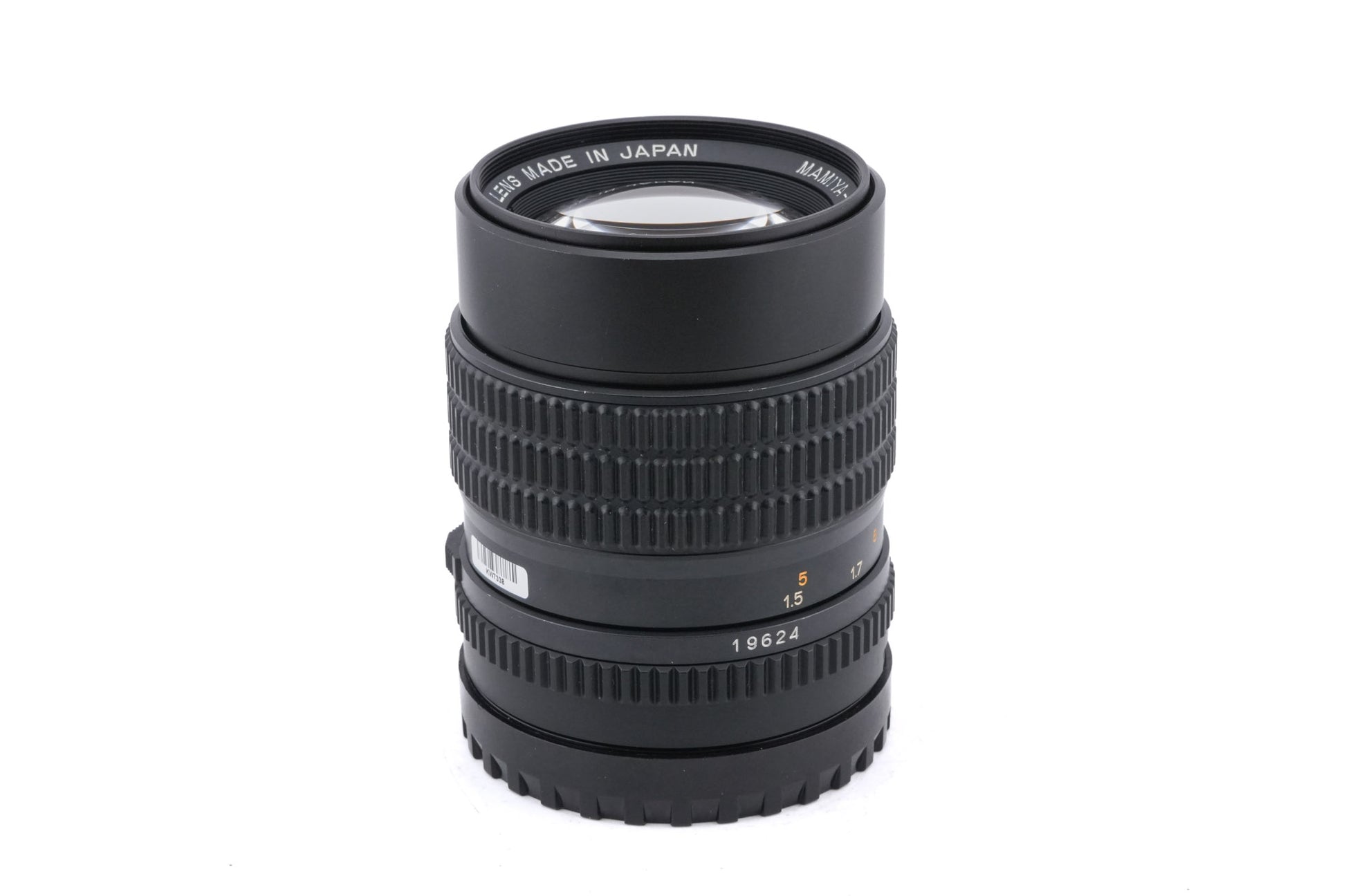 Manual focus telephoto lens made for M645 120 SLRs by Mamiya. It has a built-in lens hood and gives the equivalent field of view to a 93mm lens on full-frame/35mm. Metal body available in black.