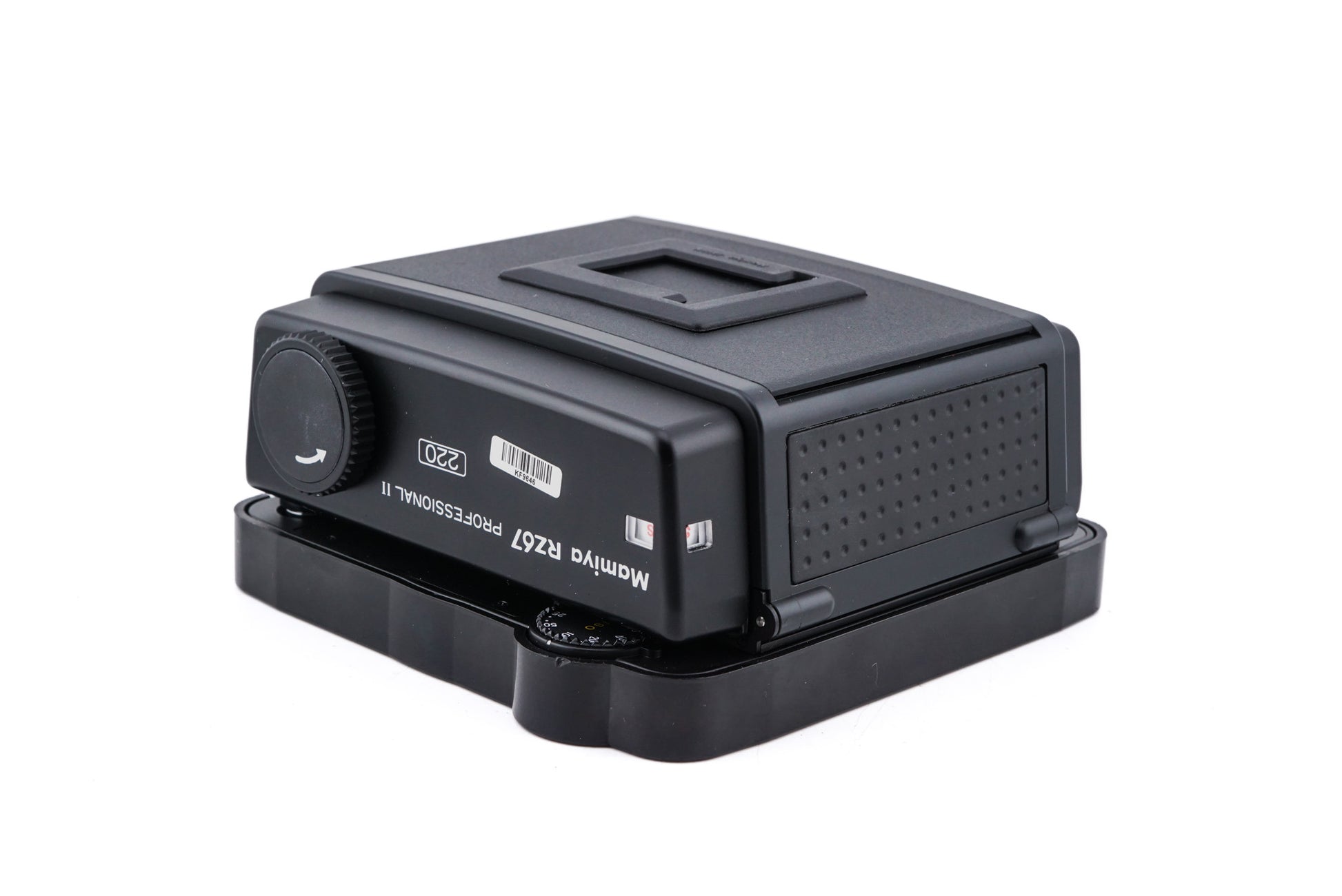 Film back made for RZ67 120 SLRs by Mamiya. This back allows for the use of 220 film and cannot be used with 120 film. This is the second version that added a film memo and dark slide holder. Itonnects to the body electronically to communicate ISO information. Plastic and metal body available in black.