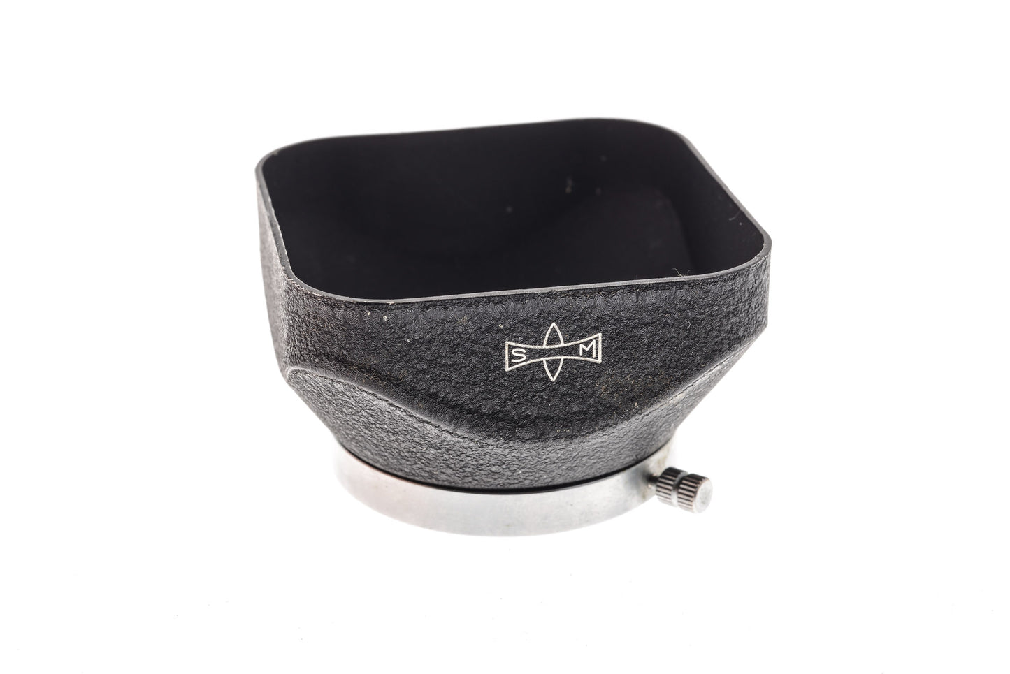Lens hood made by Mamiya for their C line of TLRs. Fits the 80mm f2.8 (chrome) and 105mm f3.5 (chrome). Attaches via tightening knob. Black & silver metal construction.