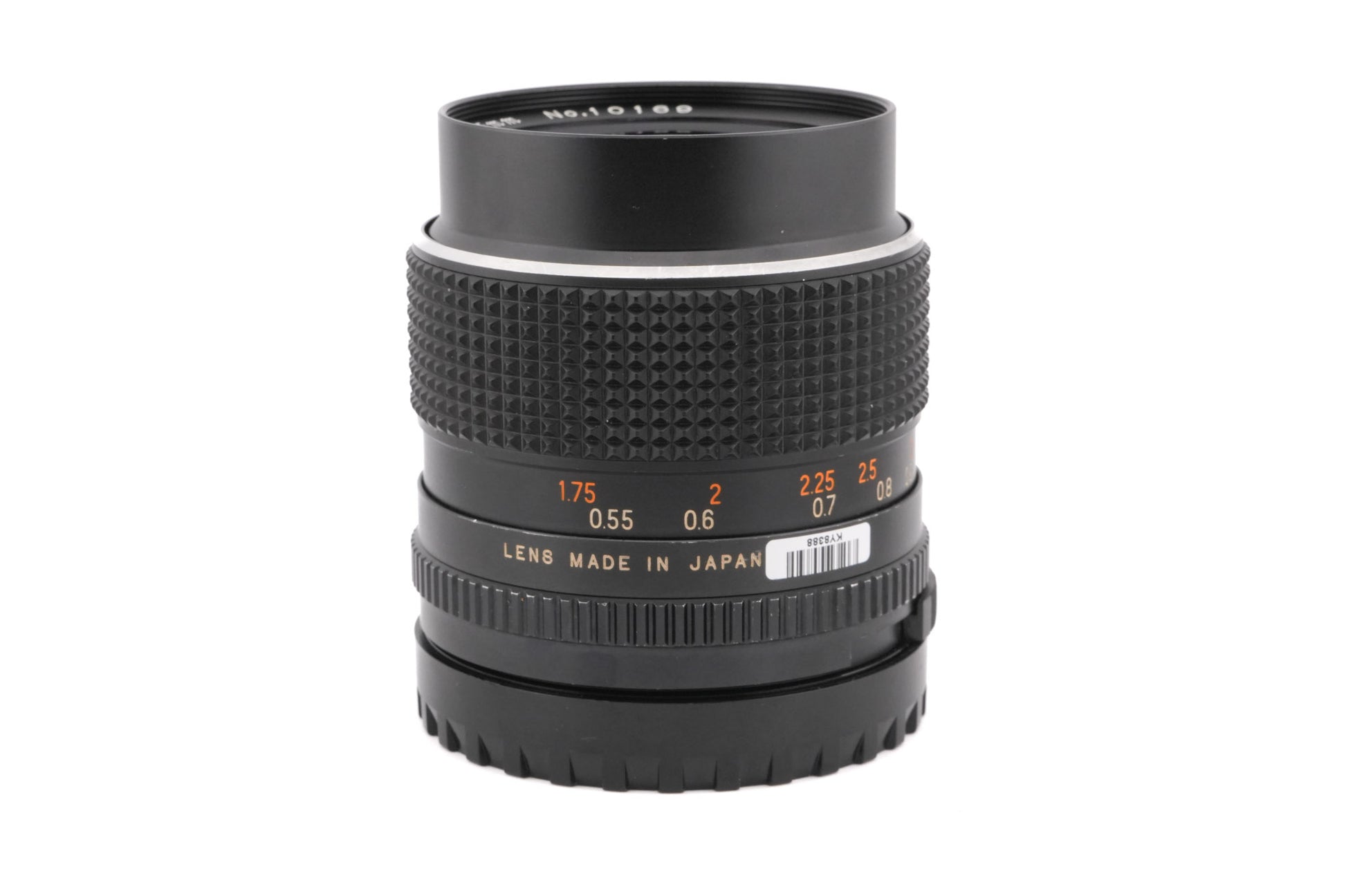 Manual focus wide-angle lens made for the Mamiya 645 system by Mamiya. The 35mm equivalent focal length is 34mm. Metal body available in black.