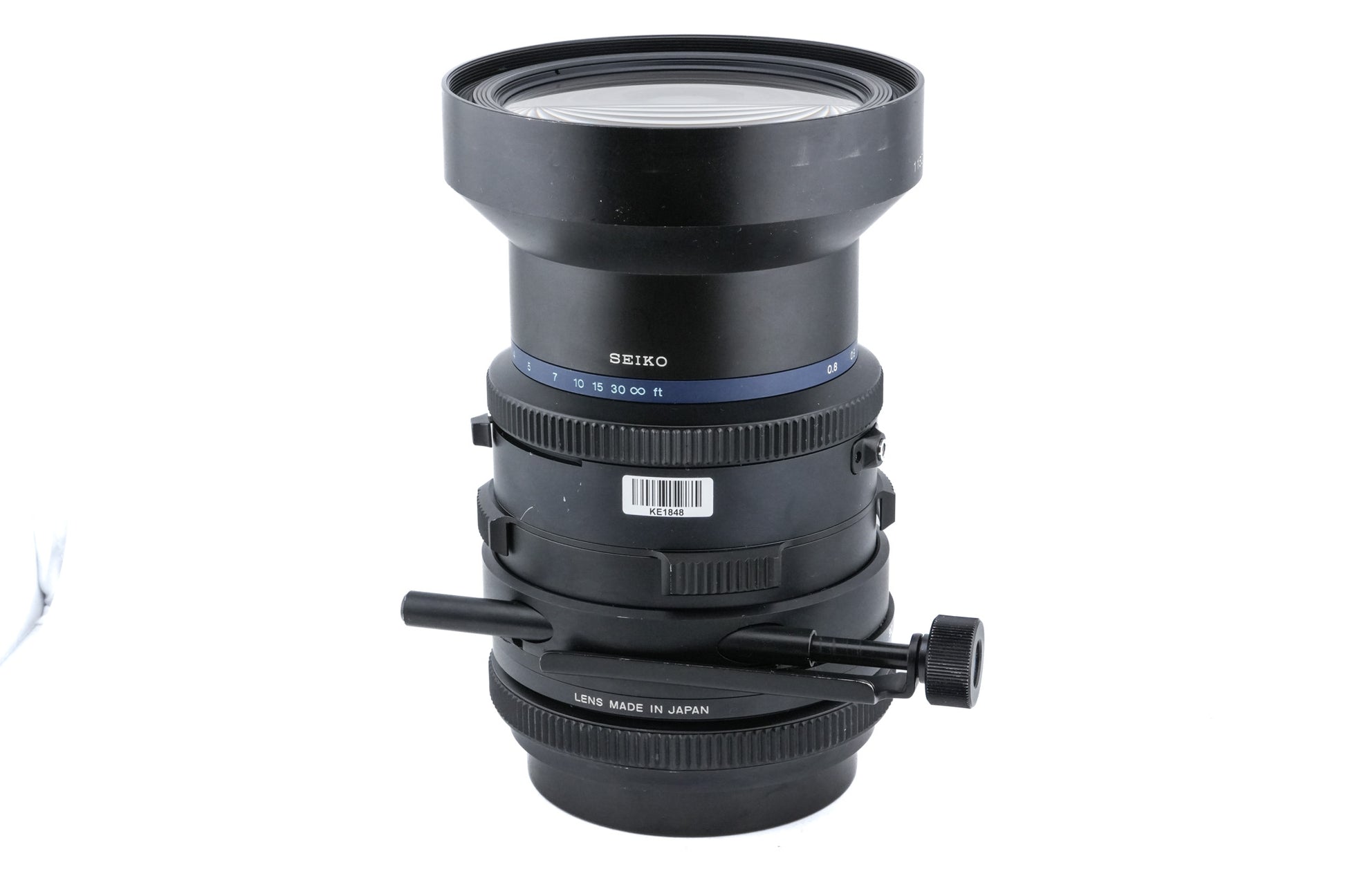Manual focus wide/normal perspective control lens made for RZ67 mount 120 SLR cameras introduced by Mamiya. The lens must be cocked manually. It has a single direction of shift but can be rotated 360° in 10° increments to allow shifting in any direction. It gives an equivalent focal length of 33.5mm on full-frame. The white lines on the shift scale indicate the 17mm limit that is possible when shifting at an angular orientation to avoid image cut-off. A small amount of cut-off may occur when shifted 17mm or more, both horizontally or vertically (depending on the bellows extension and direction of shift). This will not show up in the viewfinder as it is outside of its field of view. It has markings for in-between aperture stops. Metal body available in black.