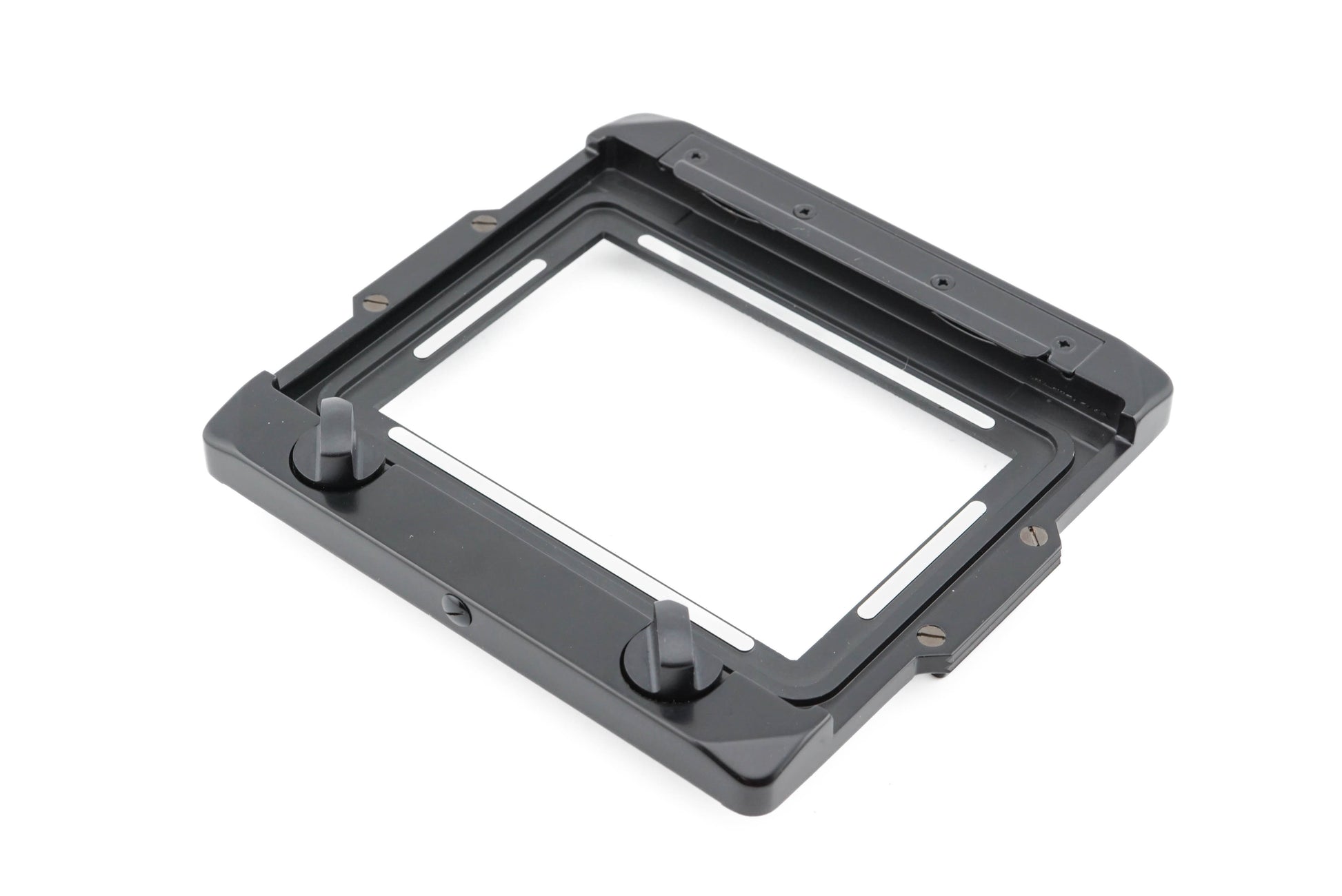 Film holder adapter made for mounting roll film holders and other holders made for Mamiya Press cameras onto Mamiya RB67 cameras. This is the horizontal mounting version. It connects to the P Adapter that sits between the M Adapter and the revolving adapter. Metal body available in black.