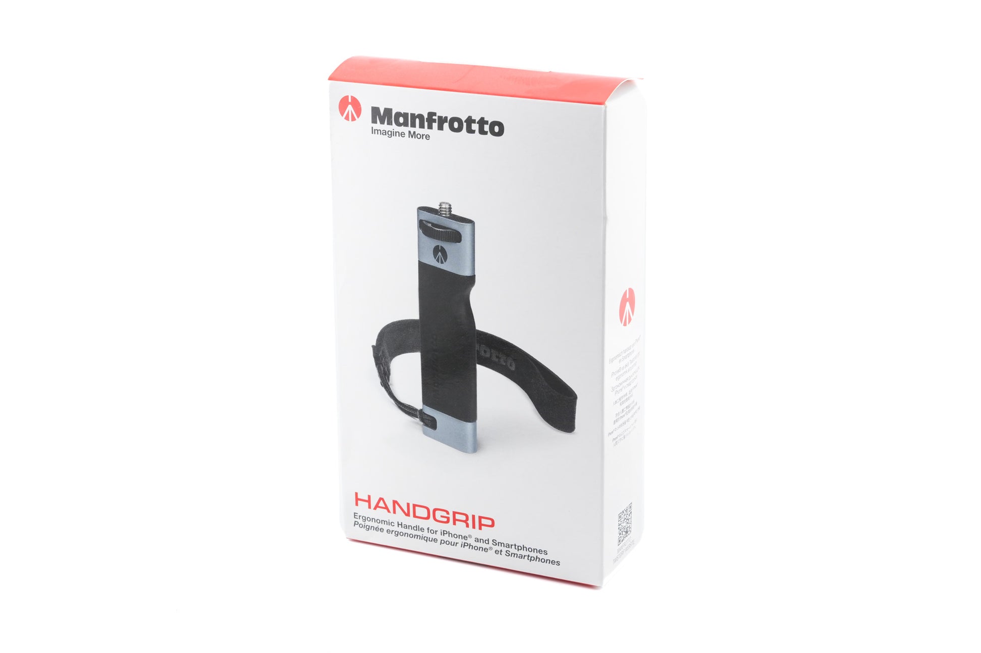Handgrip made by Manfrotto. It has a 1/4" screw and a strap. The product code is MTWISTGRIPH. Metal body available in blue/black