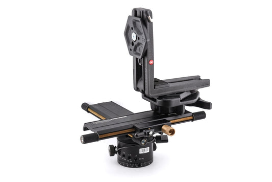 Panoramic tripod head made by Manfrotto. It has multiple sliders for moving the camera in distinct intervals in multiple directions. Metal body available in black.