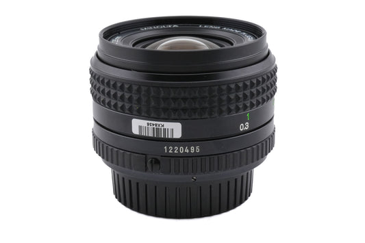 Manual focus wide-angle lens made for MD/SR-mount 35mm SLRs by Minolta starting in 1977. Metal body available in black.