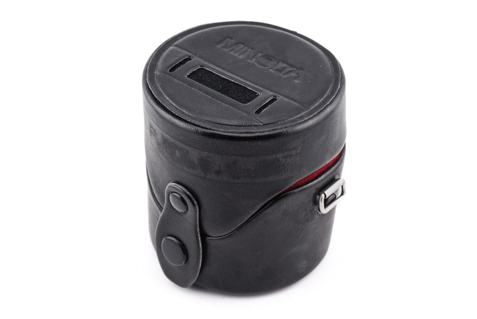 Short (~9cm) leather lens case for Minolta AF lenses. Diameter is approximately 8cm. Leatherette outside with padded inside.
