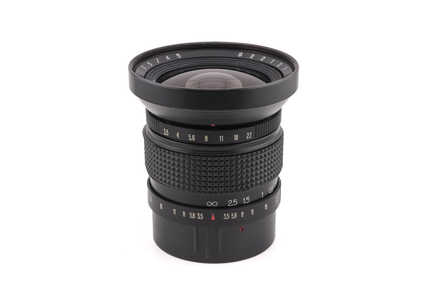 Manual focus wide-angle lens made for Salyut mount 120 SLR cameras in the Soviet Union. The lens is optically based on the Carl Zeiss Jena 50mm f4 Flektogon, but it was redesigned to increase the lens speed. Metal body available in black.