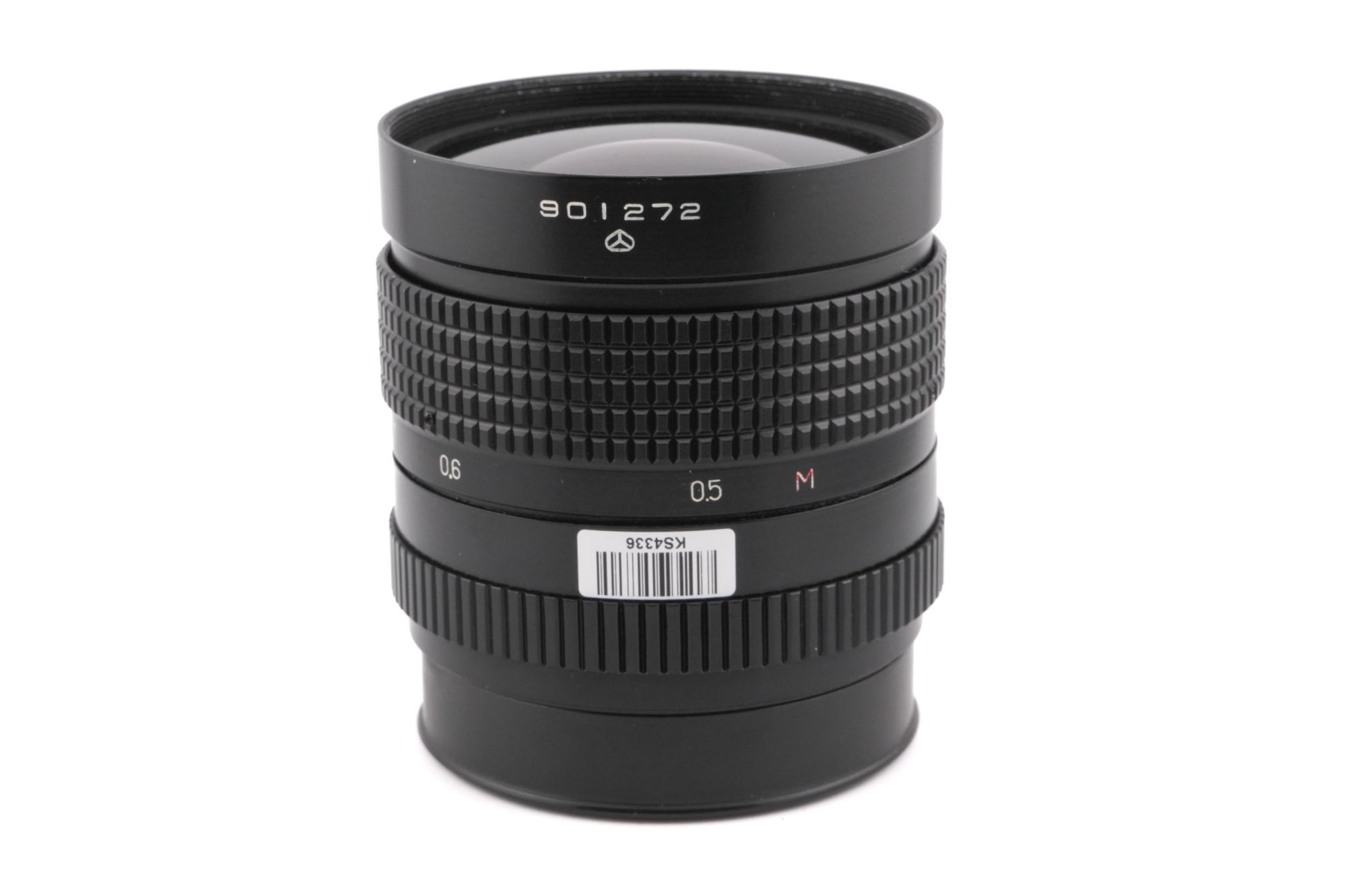 Manual focus wide-normal lens made for Pentacon Six mount 120 SLRs in the Soviet Union. Some copies have copper aperture blades. It gives the equivalent field of view to a 36mm lens on full frame / 35mm. Metal body available in black.