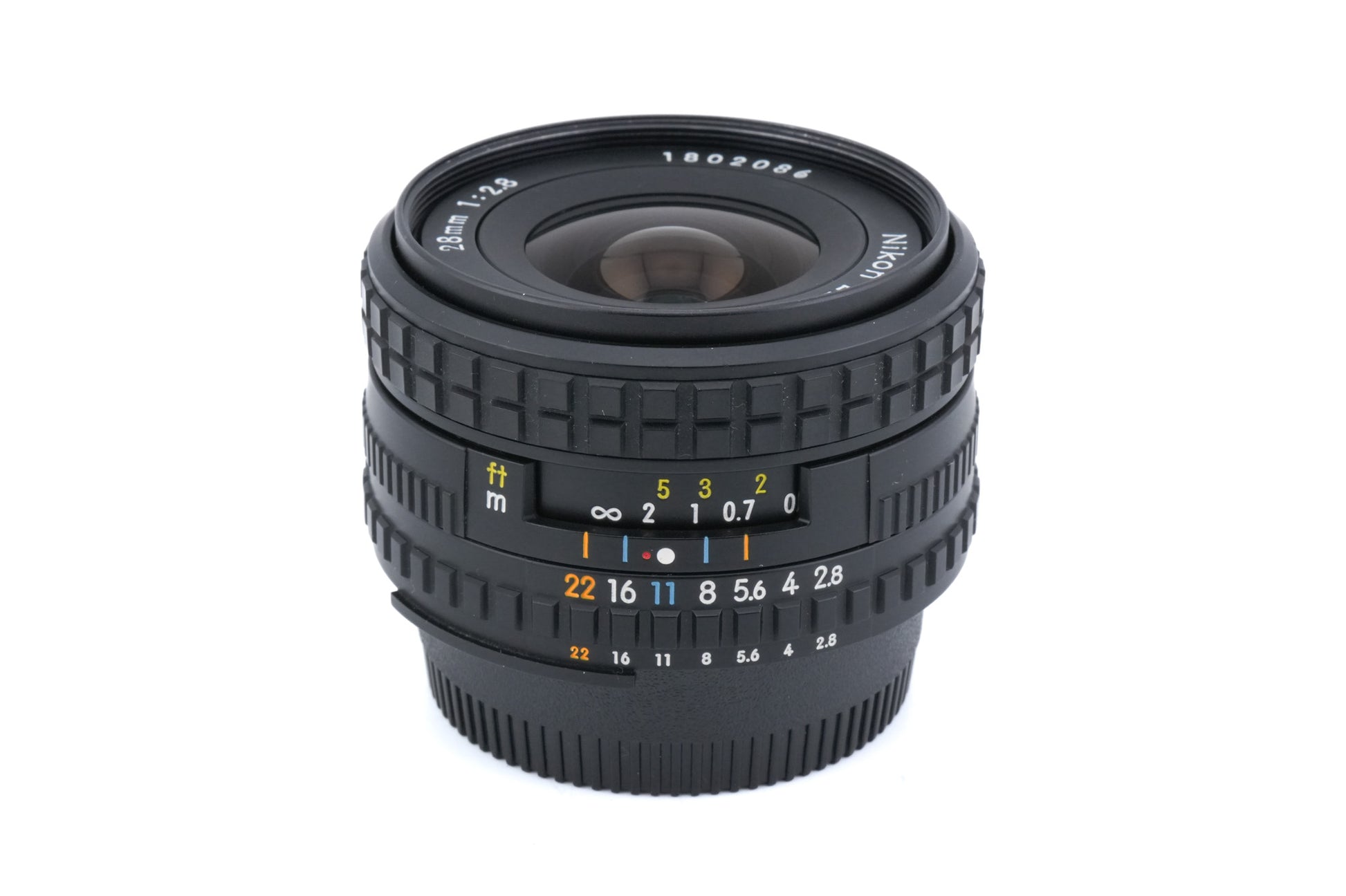 Manual focus wide-angle lens made for F-mount 35mm SLR cameras introduced by Nikon starting in 1979. It has the AI ridge and AI-S indent, which means it will meter properly on most manual Nikon cameras (excluding the F, F2, and Nikkormats) and can be used with the advanced program modes of later cameras. Older models are all black and newer ones have a silver ring above the aperture ring. Plastic body available in black.